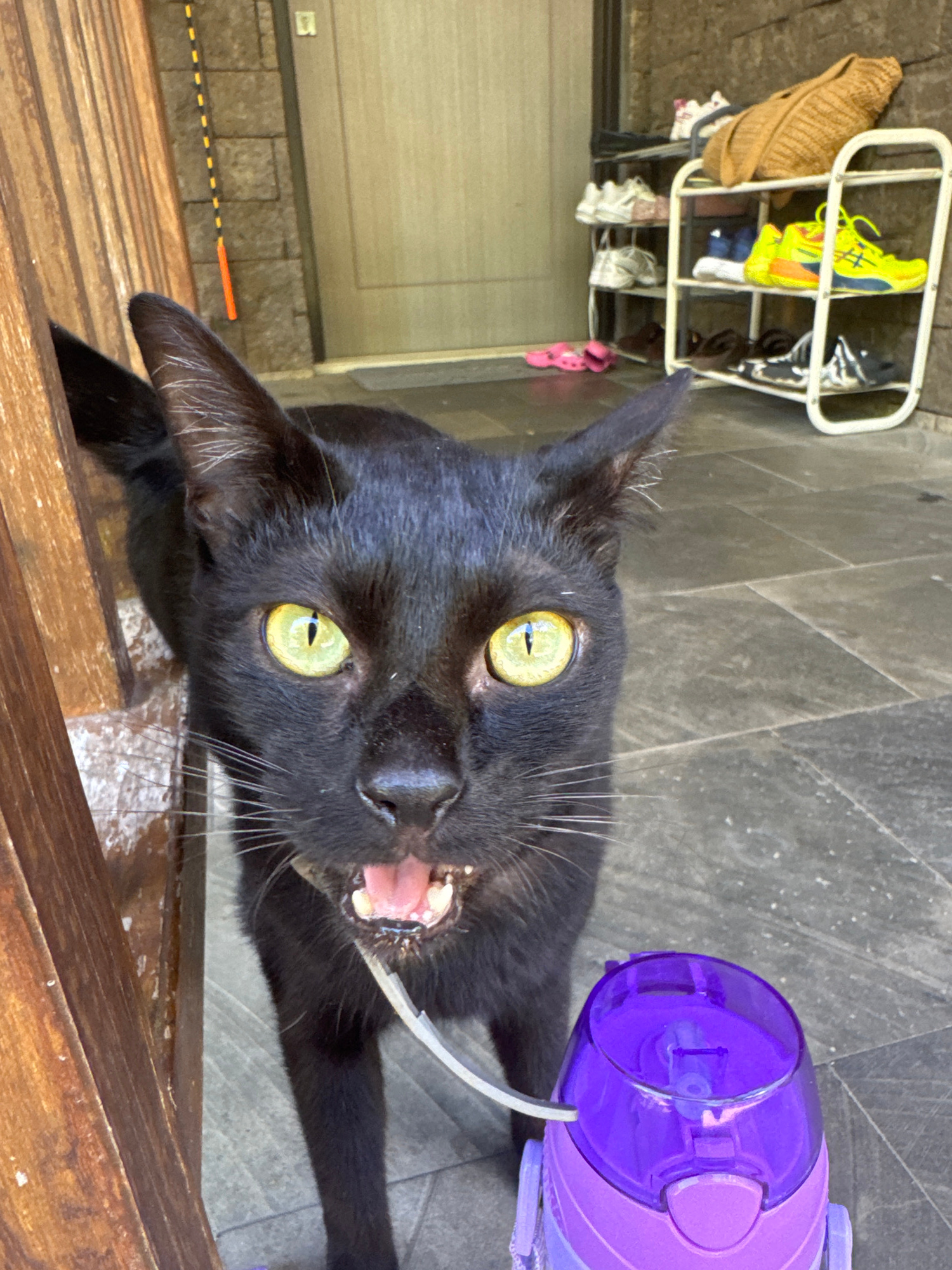 An upward-looking, full-frame shot features a black cat with striking, wide yellow-green eyes, appearing to be captured mid-action or interaction. The cat's body is oriented vertically within the fram…read more