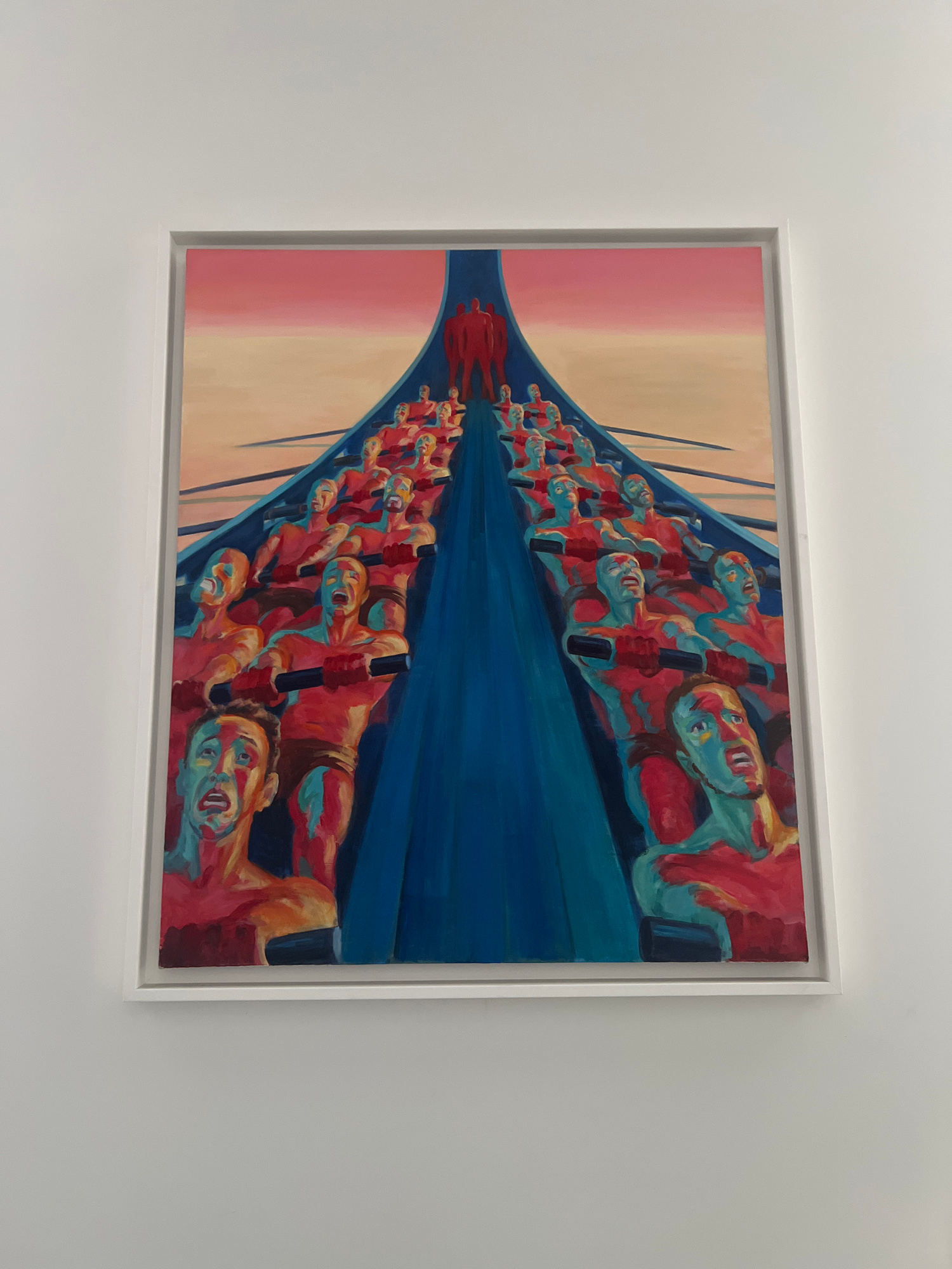 A framed painting hangs on a white wall. The artwork depicts two rows of people rowing a boat. The background is a gradient of pink and beige. The boat and water are blue. The rowers are painted in sh…read more