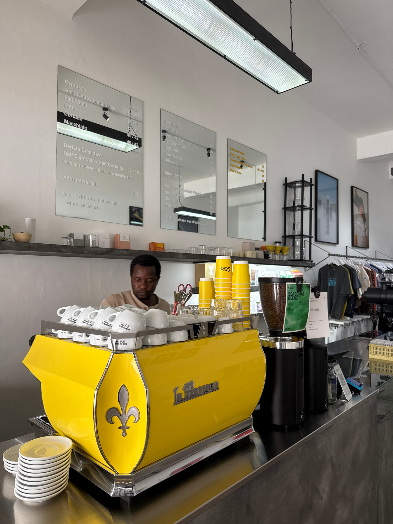 The scene depicts the interior of a cafe, likely in Cape Town, South Africa, focusing on the barista station. A man is partially visible behind a bright yellow espresso machine, possibly interacting w…read more
