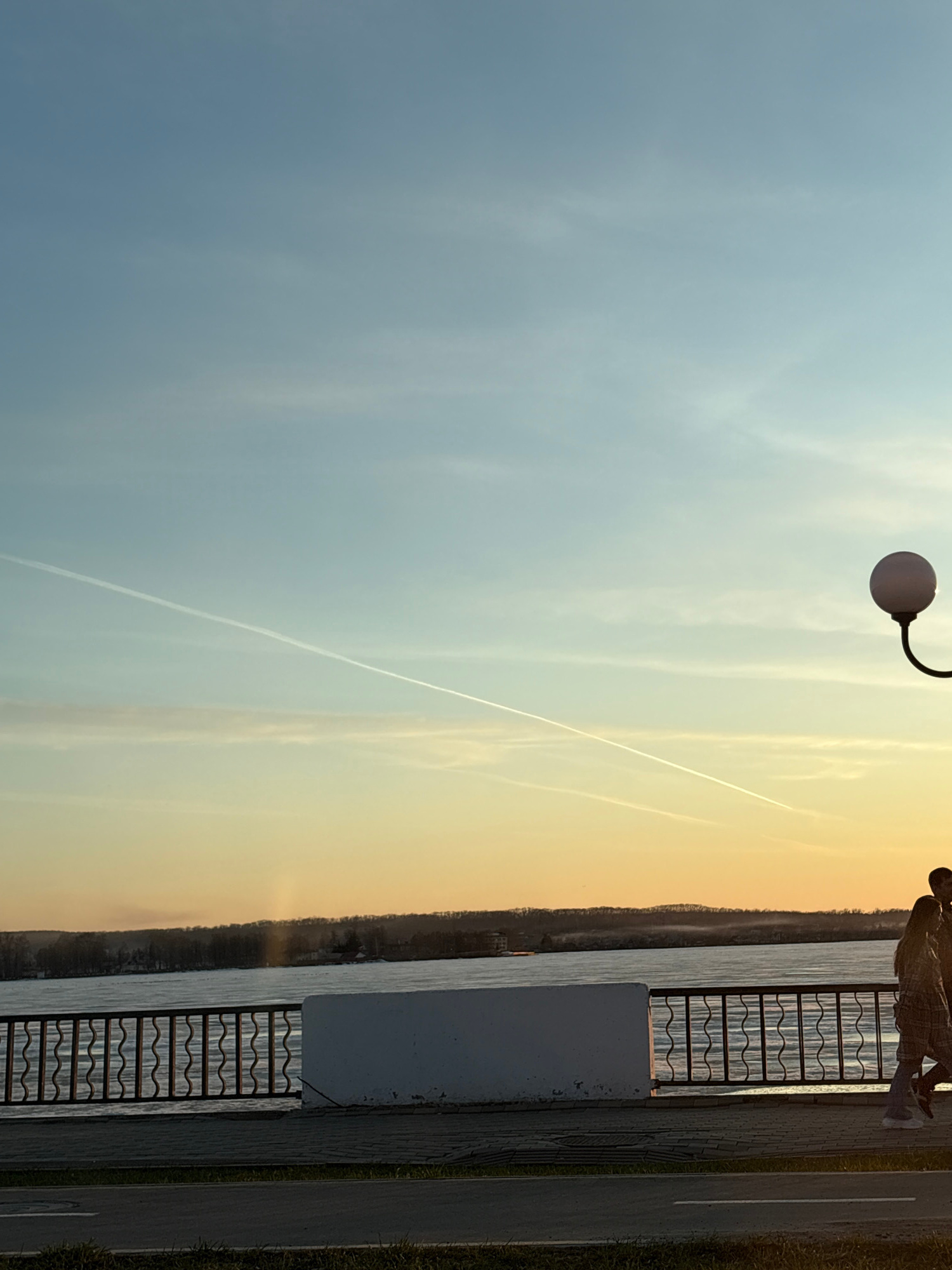 This image captures a serene waterside scene, likely along a river or large lake in Votkinsk, Russia, at either sunrise or sunset. The sky displays a beautiful gradient, transitioning from a soft, cle…read more