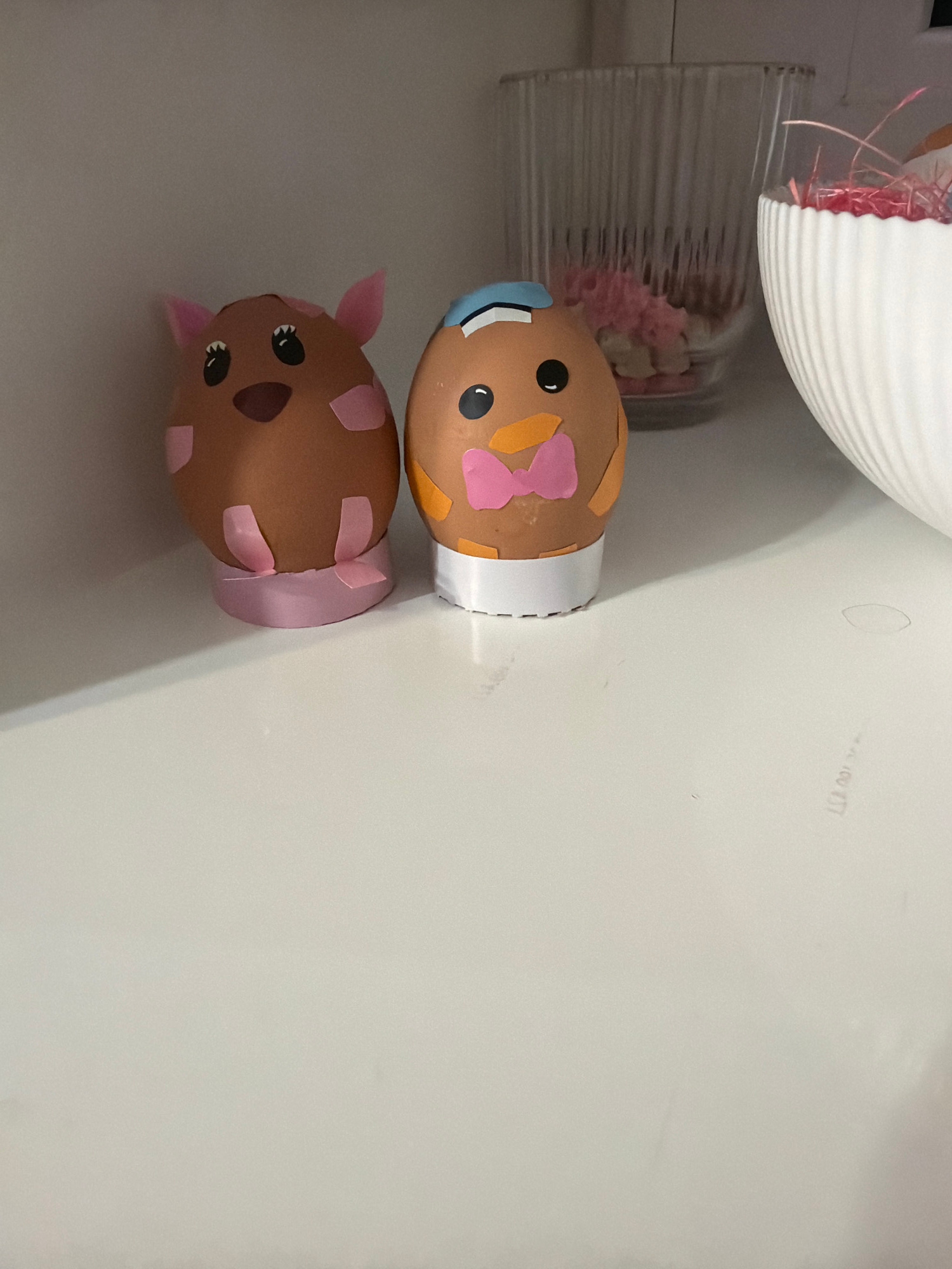 The image shows two decorated eggs on a white surface. The top egg is decorated to resemble a person with a blue headband, orange and pink hair bows, and black eyes. The bottom egg is decorated to res…read more