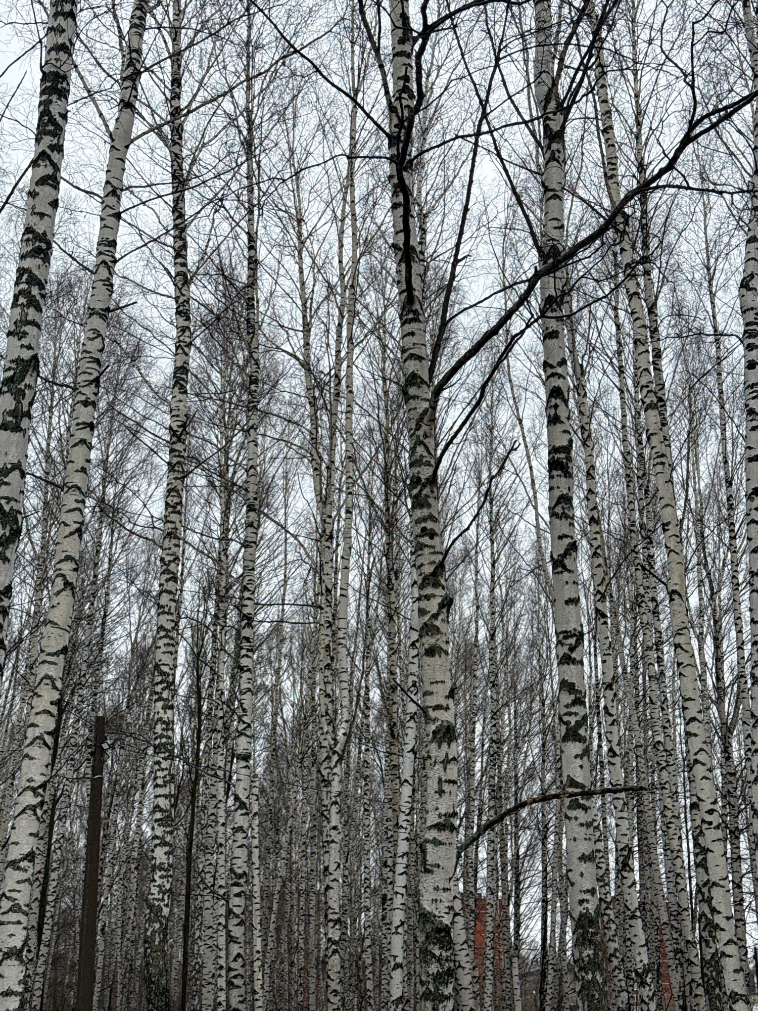 The image shows a dense birch forest. The trees are tall and slender, with white bark marked with black streaks. The branches are bare, suggesting it is either winter or early spring. The viewpoint is…read more