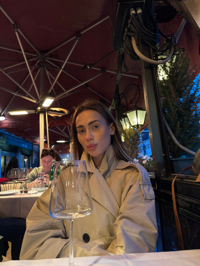 A young woman with long, straight brown hair and light eyes is seated at an outdoor restaurant table in Venice, Italy, in the evening. She wears a light beige double-breasted trench coat and looks dir…read more