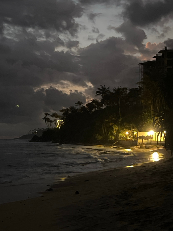 The image depicts a dusk or nighttime scene at a beach in Thalaramba, Sri Lanka. A heavily clouded sky with dark grey cumulus formations and hints of lighter grey and subtle pink hues dominates the up…read more