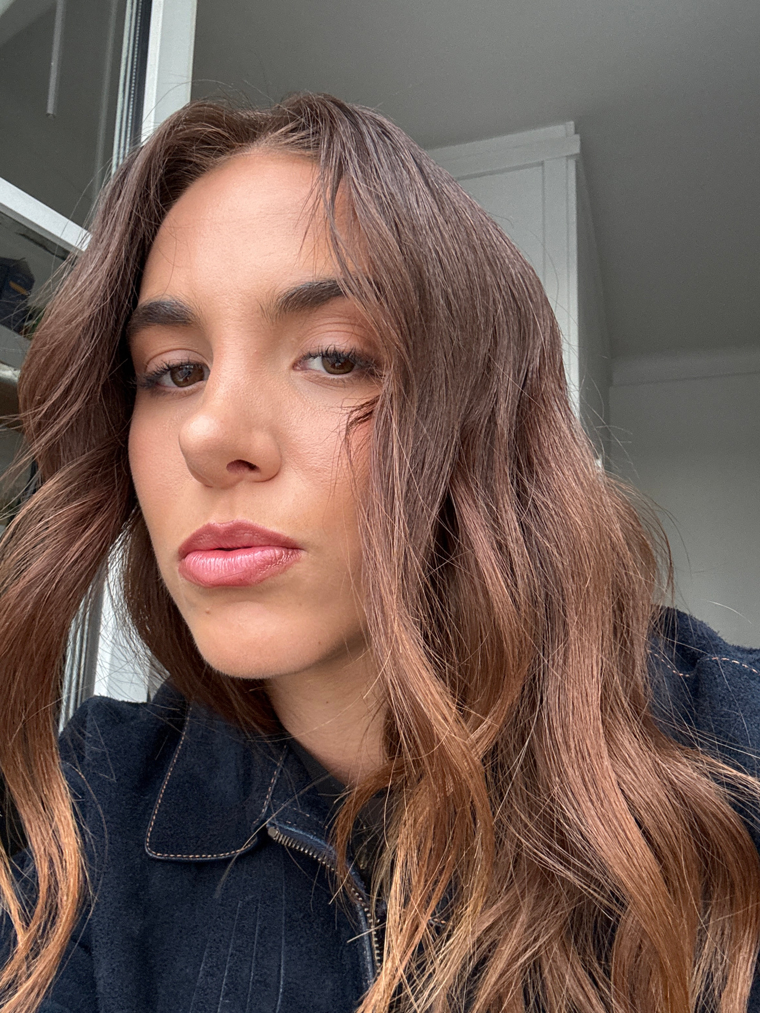 A brunette woman with long, wavy hair is photographed indoors at a close range. She has fair skin and brown eyes and is wearing lip gloss. She is wearing a dark blue jacket with visible stitching. Theβ¦read more