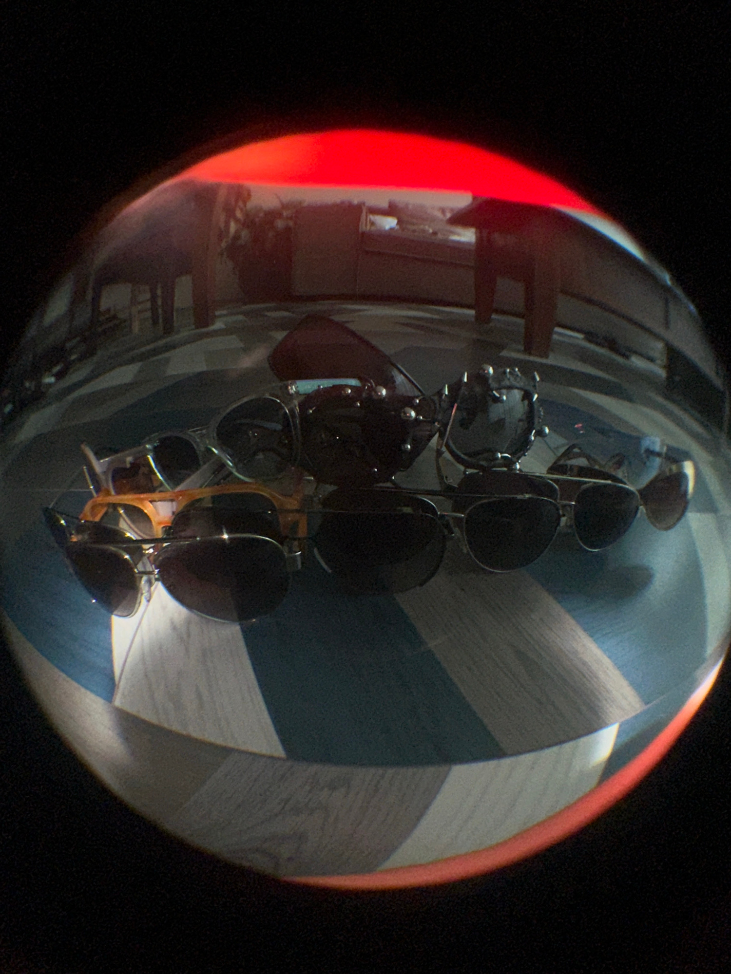 A fisheye lens captures an indoor scene with a rack of sunglasses as the central focus. The foreground shows a tiled floor with alternating light gray and dark gray/blue squares. In the background, distorted by the fisheye, elements of a room are visible, including what appears to be furniture and a window. A vibrant red streak on the left side of the frame adds a color contrast. The remaining background is a solid black. | Open Wire