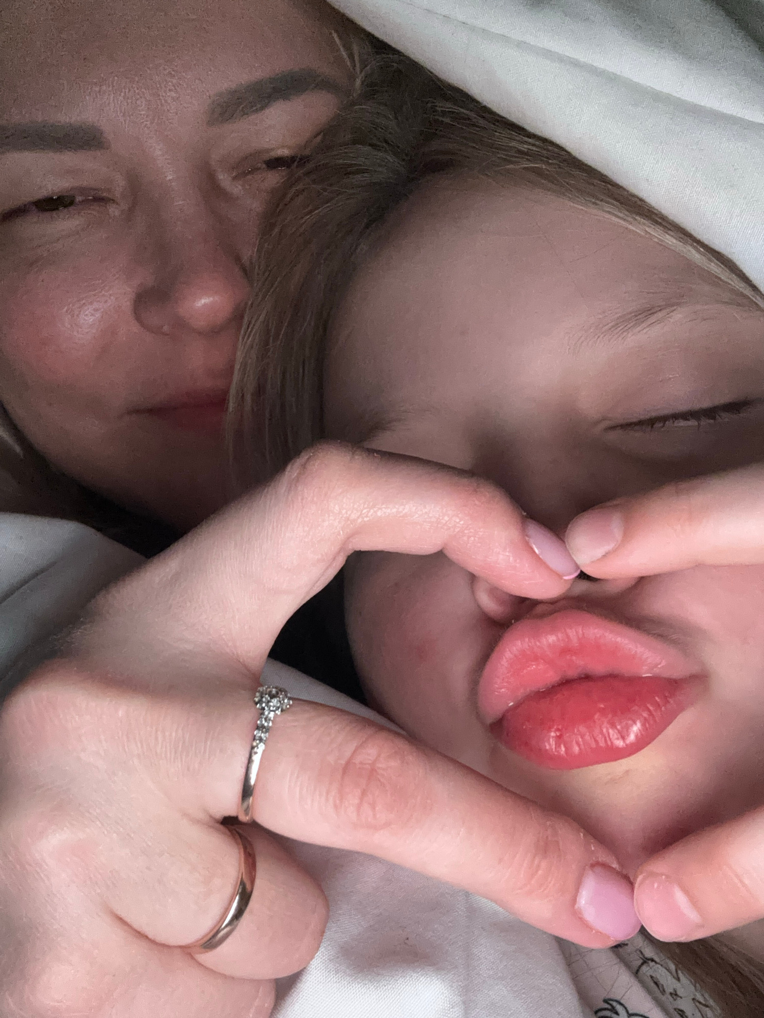 A close-up, intimate image shows two faces in close proximity. The upper face, seemingly that of a child, is partially obscured by fingers manipulating their lips, possibly stretching or pulling them.…read more