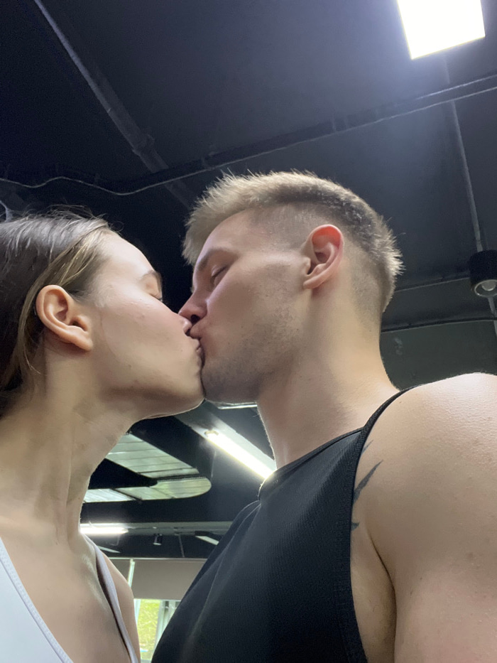 Two individuals are captured in a close embrace, sharing a kiss. The image is taken from a low angle, looking upwards at the pair, who are positioned diagonally across the frame. The person on top, p…read more