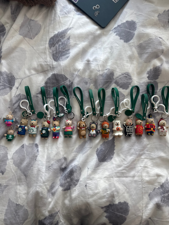 A collection of Starbucks bear keychains arranged in a vertical line on a patterned bedspread. The bears feature various costumes and themes, each attached to a green Starbucks-branded loop and a whit…read more