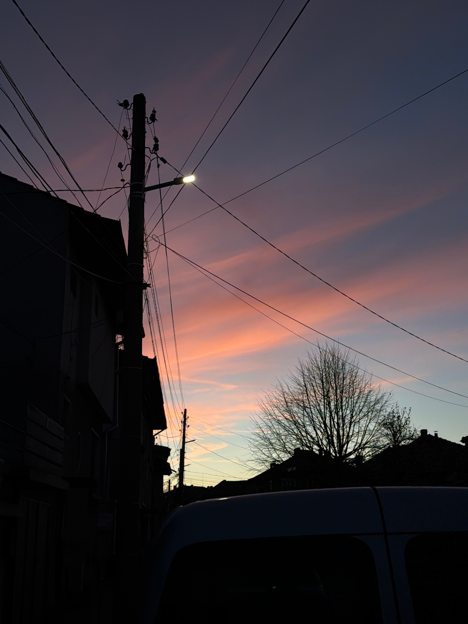 The image captures a scene in Lovech, Bulgaria, at dusk or dawn. The sky exhibits a gradient of colors ranging from pink and orange near the horizon to a darker purple-blue higher up. Several telephon…read more