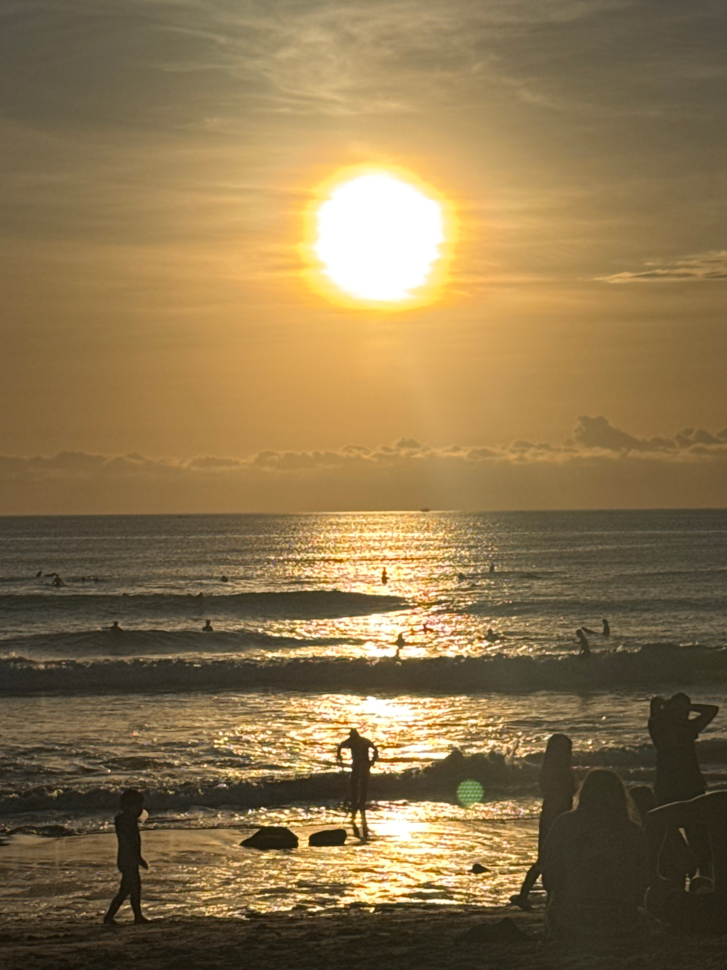 The image depicts a breathtaking golden hour scene, likely a sunset or sunrise, over a vast ocean in Kuta Selatan, Indonesia. A brilliant, almost blinding sun is the dominant feature on the left side…read more