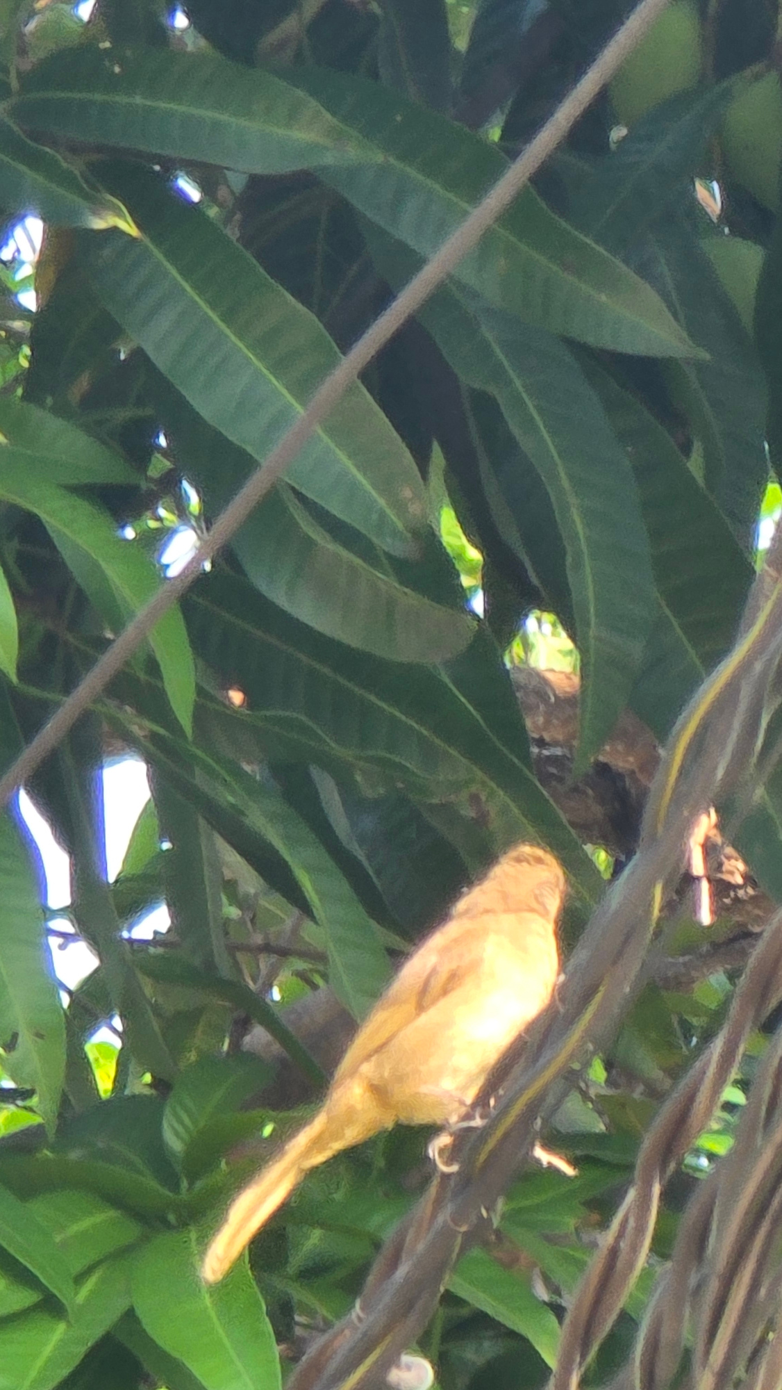A yellowish-tan bird is perched on a dark wire amidst dense green foliage. The location is in Bac Natural Heritage Area Trang, Vietnam. The leaves are elongated with prominent veins, partially obscuri…read more