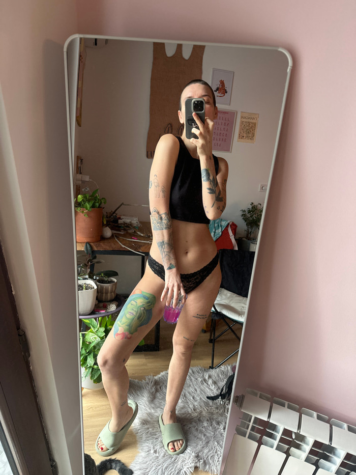 A mirrored image shows a person in black underwear and a cropped top, holding a purple glass. The person has various tattoos on their arms and a large, colorful tattoo on their thigh. They are wearing…read more