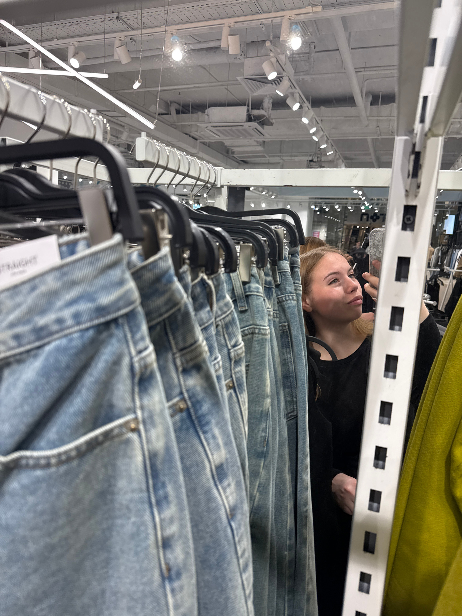 This image depicts a young female inside a retail clothing store, located in Sochi, Russia. In the immediate foreground, a row of light blue denim jeans, identified as "STRAIGHT" fit by a visible tag,…read more