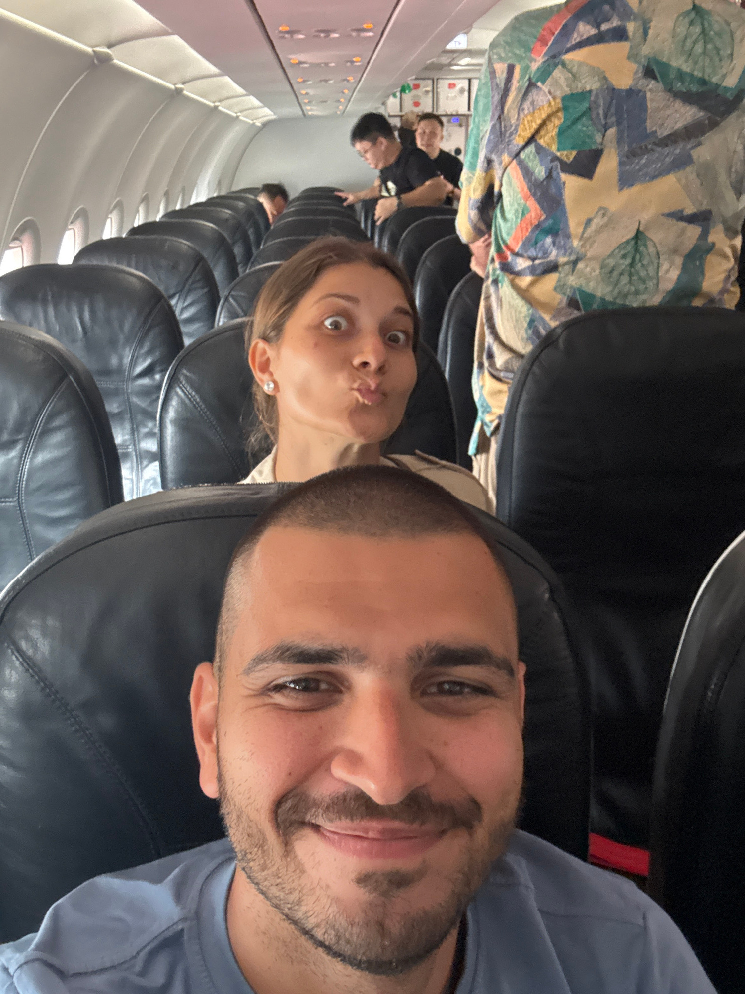 The image shows two people on an airplane. The man is in the foreground taking a selfie. A woman is in the background making a funny face. Other passengers are visible further down the aisle. The seat…read more
