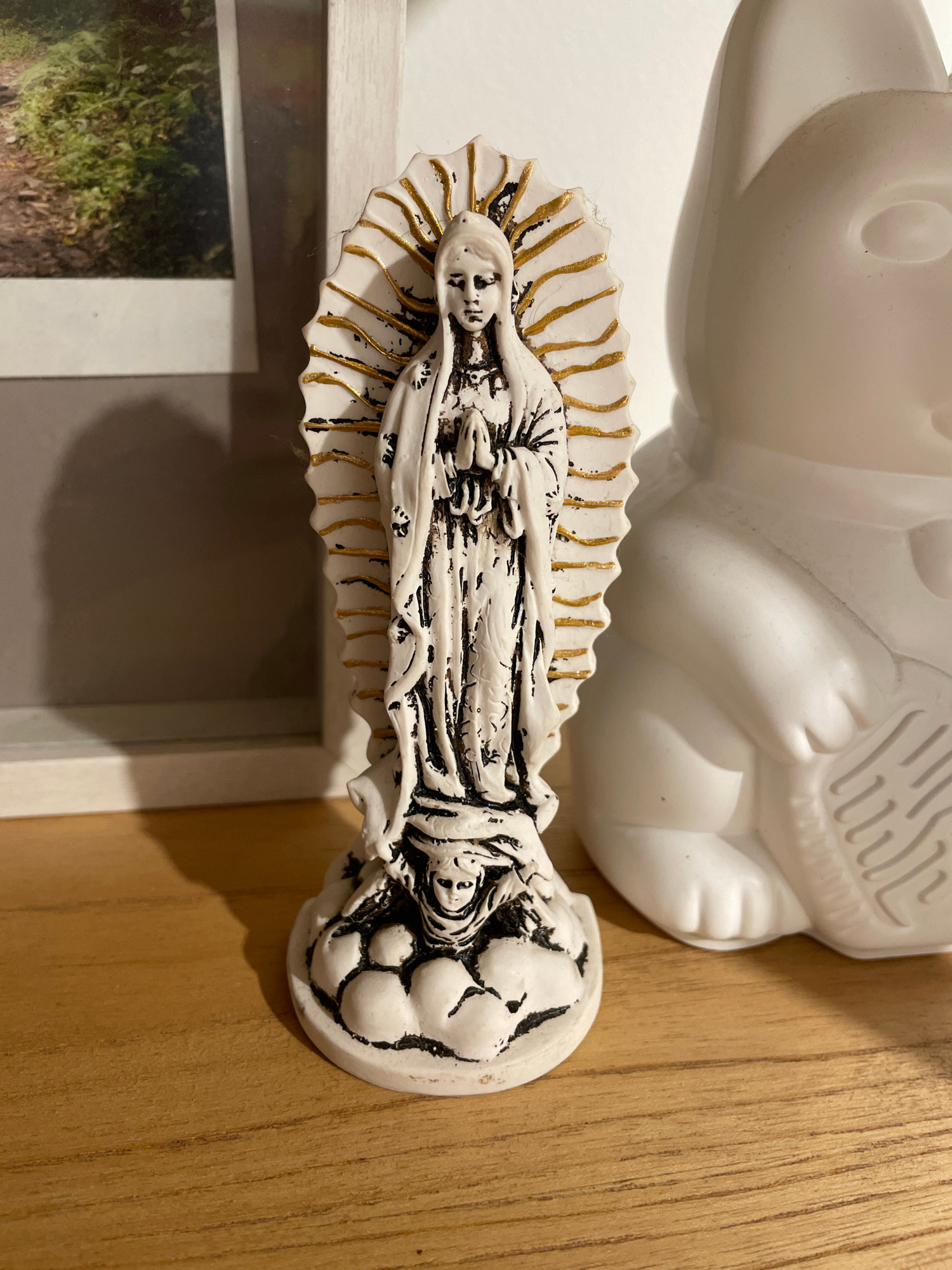 The image shows a close-up view of a white and gold Our Lady of Guadalupe statue resting on a light-colored wooden surface. A partial view of a white figurine is visible at the top of the image. Part…read more