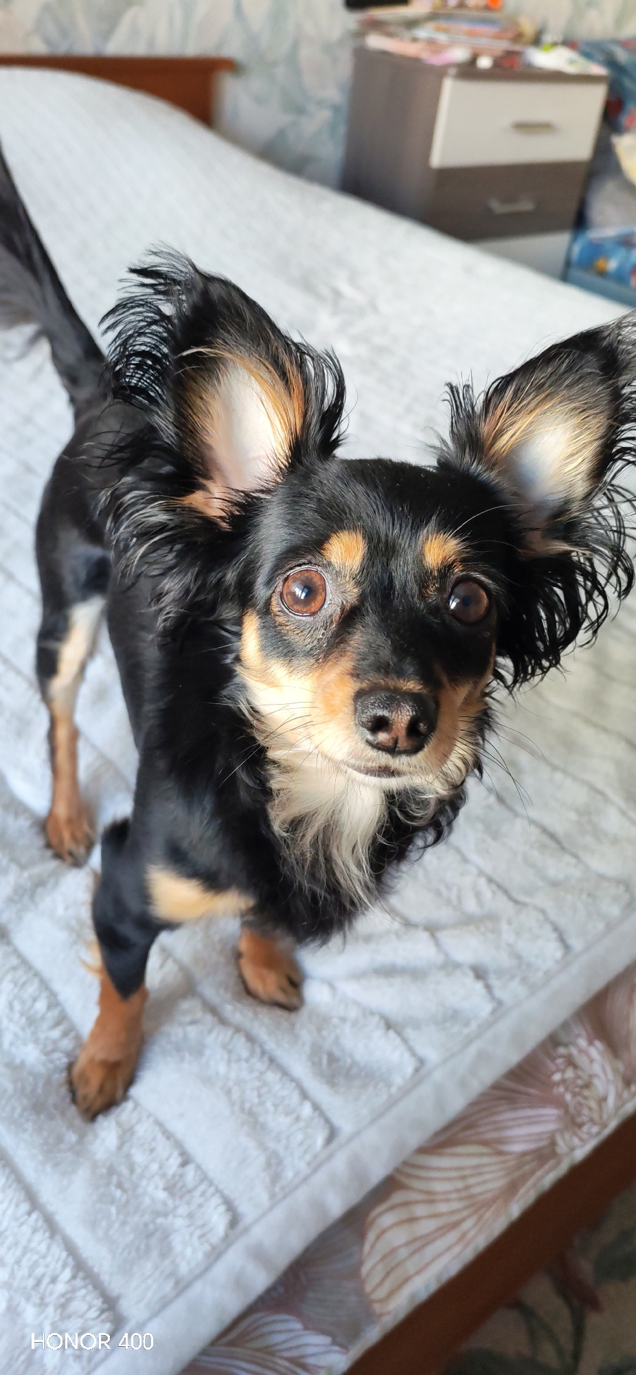 A small, black-and-tan Russian Toy Terrier stands on a white, textured blanket in what appears to be an indoor setting. The dog is facing the camera with its head tilted slightly upwards, its large, u…read more