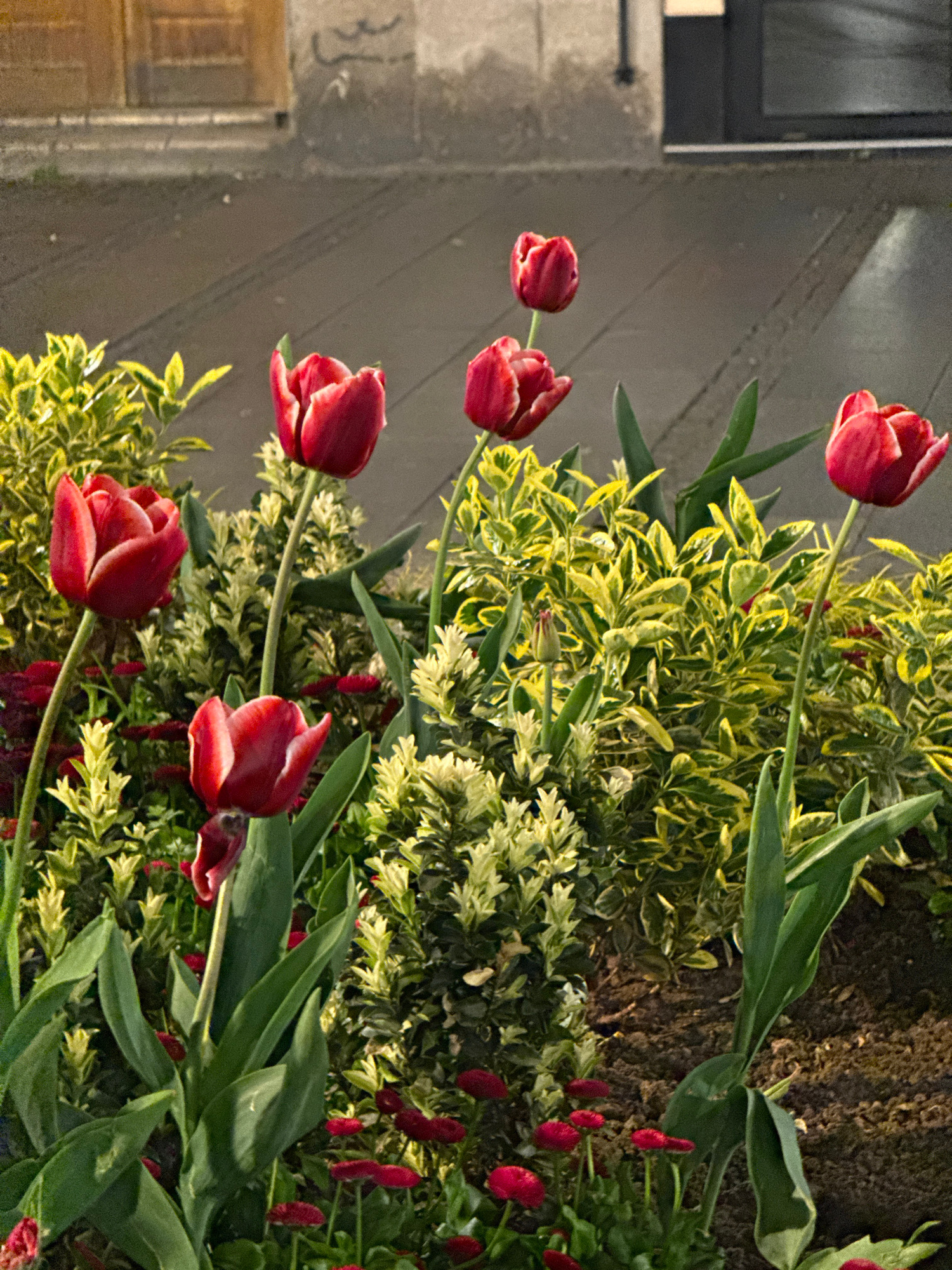 The image shows a close-up view of a flower bed featuring red and white tulips, accompanied by variegated green and yellow foliage and small red flowering plants. The flower bed appears to be situated…read more