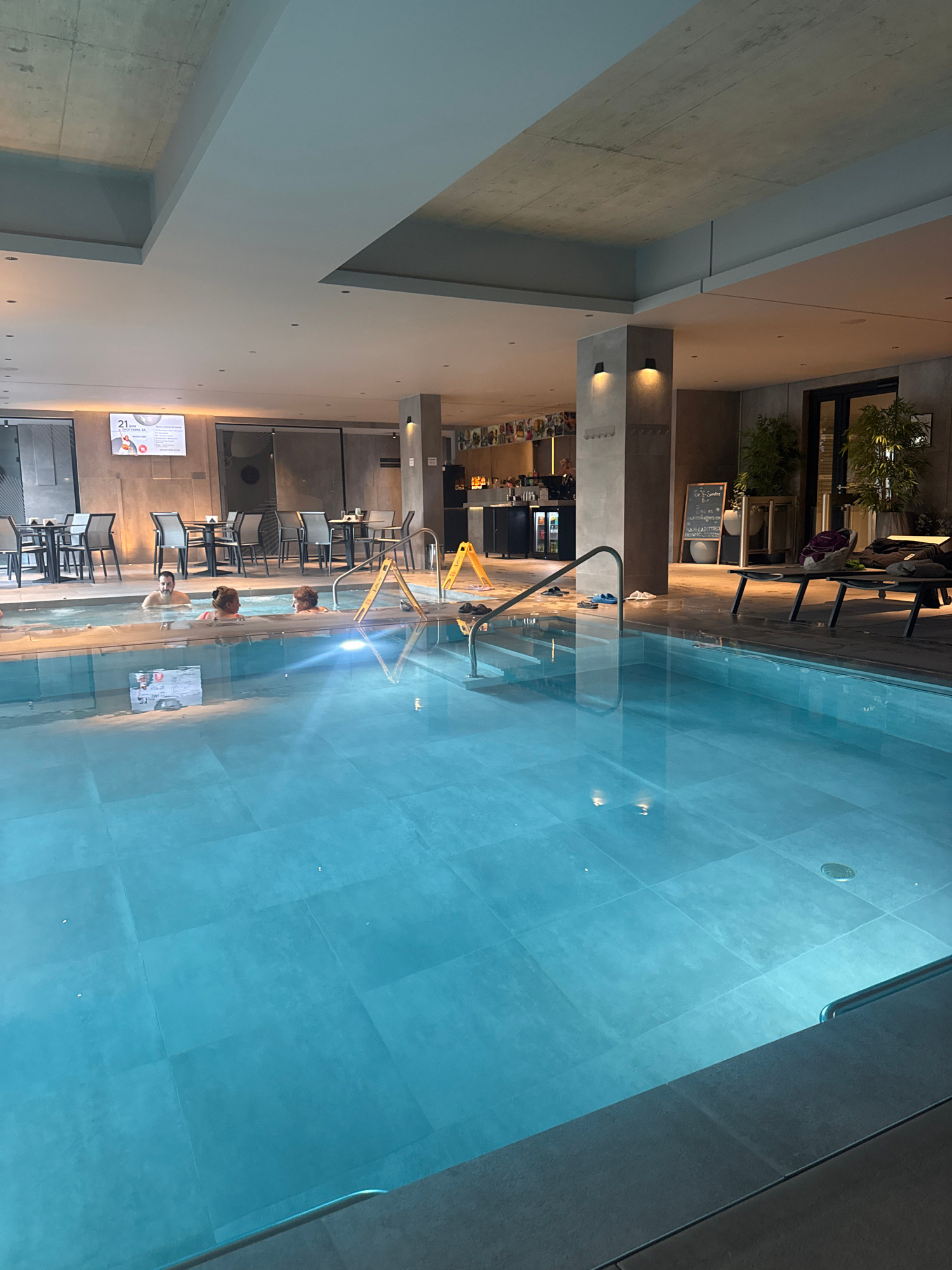 The image depicts an indoor spa and pool area within the Hotel Bulgaria Burgas, located at Aleksandrovska Street 21, Burgas, Bulgaria. The scene features a large, rectangular swimming pool with blue-…read more