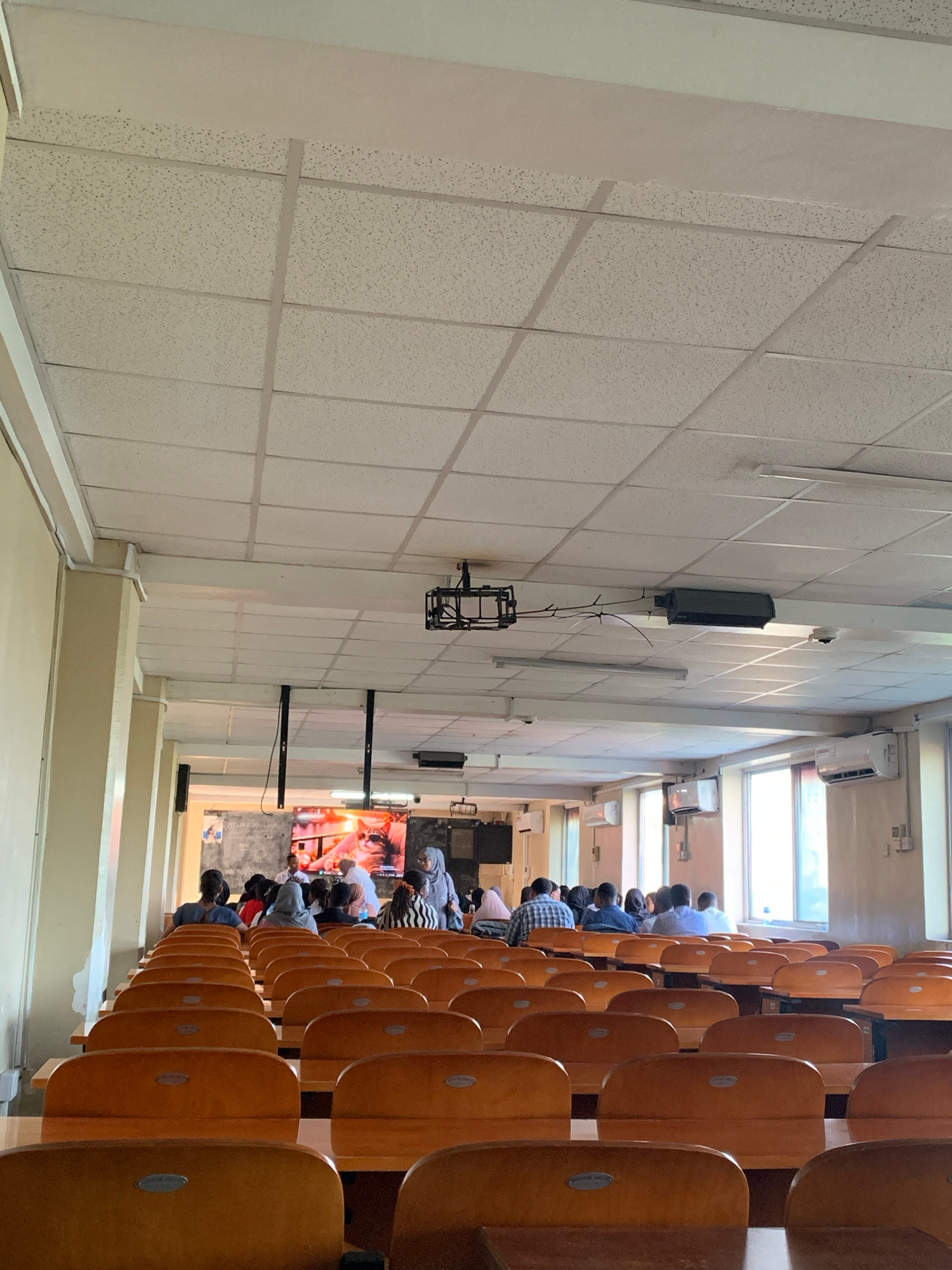 The image, taken in Dar es-Salaam, Tanzania, captures an indoor auditorium or lecture hall during daytime. Rows of light brown wooden chairs, featuring cushioned seats and backs with a subtle silver o…read more