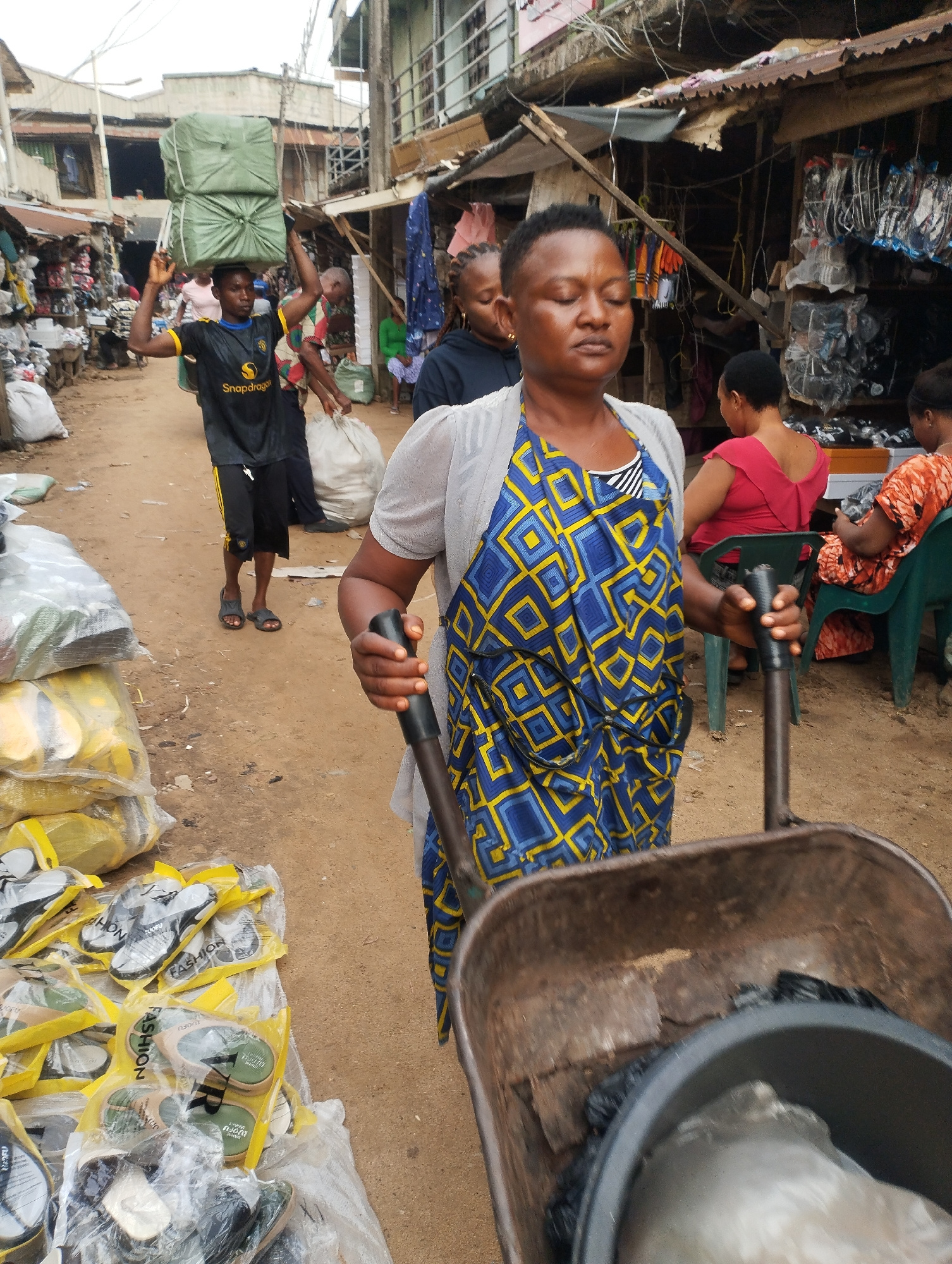 The image depicts a bustling scene in what appears to be the Fegge area of Onitsha, Nigeria, characterized by informal markets and commercial activity. A woman is the primary subject, pulling a rustyβ¦read more