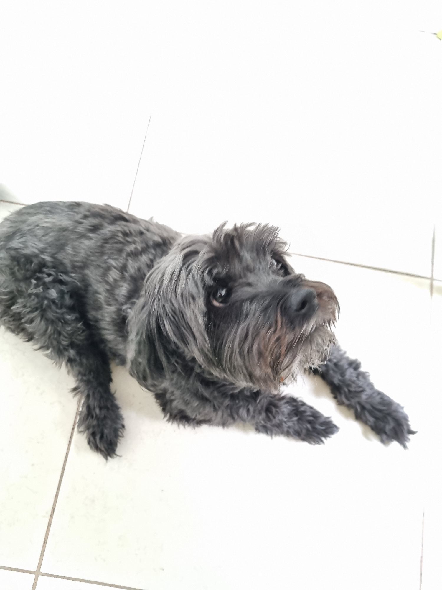 The image captures a small, dark-colored dog with shaggy black and dark grey fur, likely a terrier breed. The dog is sitting upright on a light-colored tiled floor, with its front paws raised, appeariβ¦read more