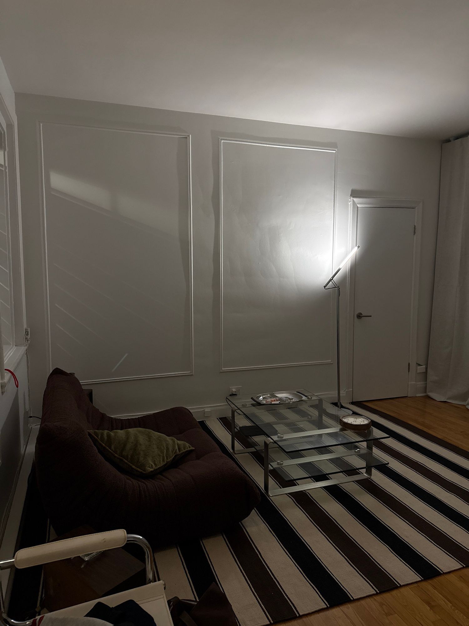 The image depicts an interior scene, potentially within a residential dwelling. A wall, painted in a light color, has two framed rectangular sections. Above the framed sections is a door or access panβ¦read more
