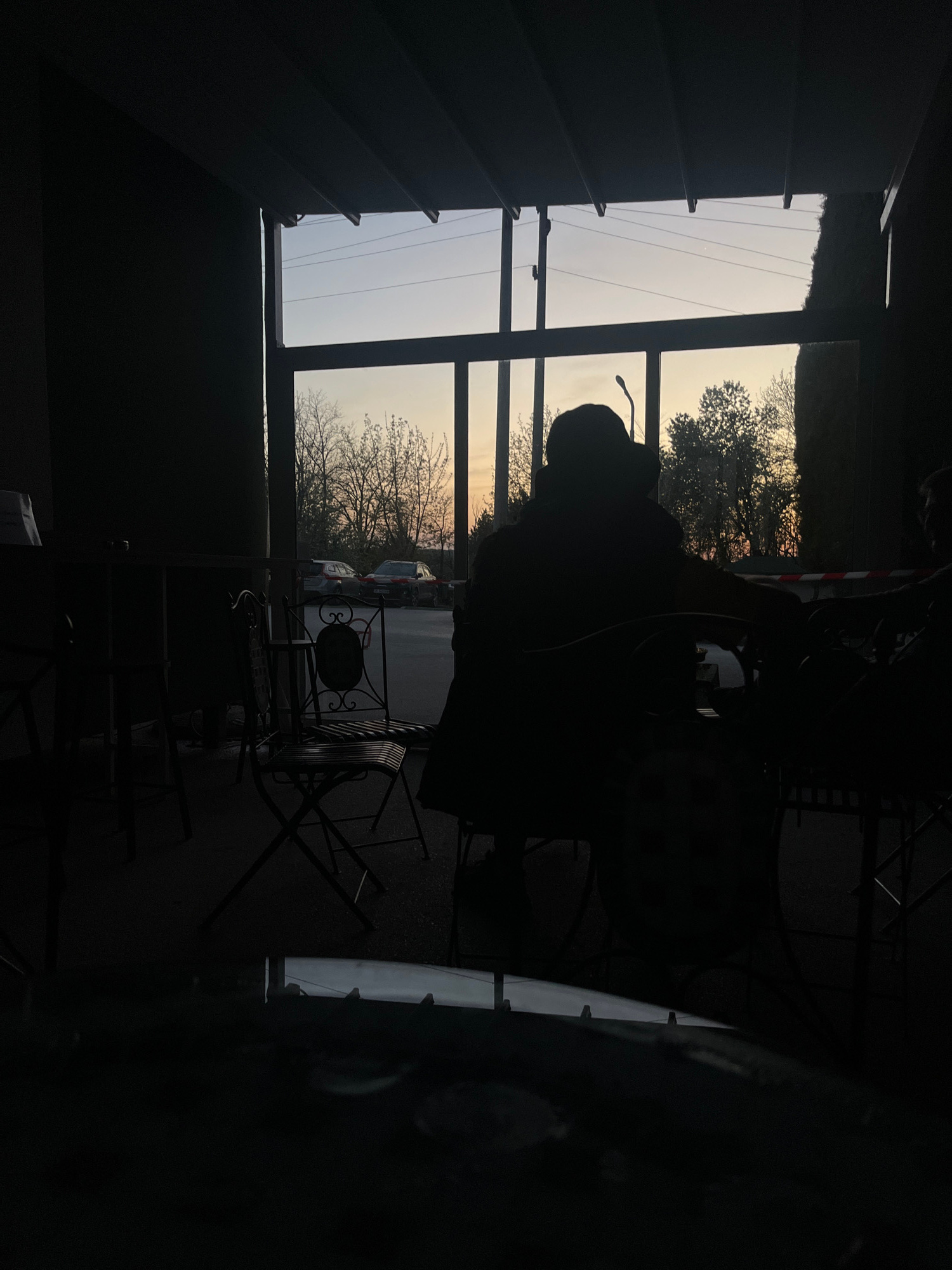 The image captures a high-contrast scene looking out from a very dark interior through large windows during either dawn or dusk. The interior is largely silhouetted, with indistinct dark shapes fillin…read more
