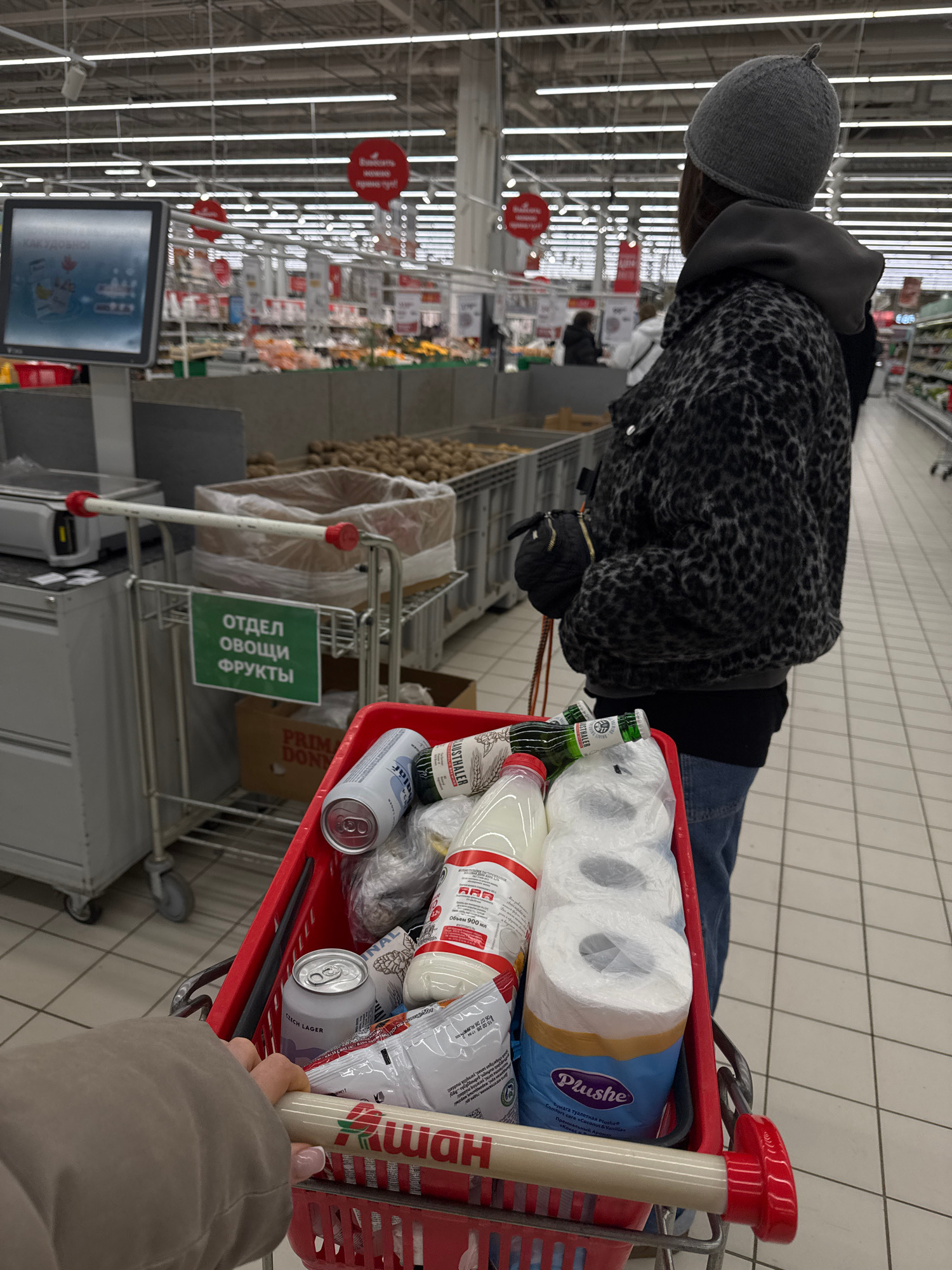 The image shows a shopping cart in a supermarket, likely in Moscow, Russia, based on Cyrillic text on signs and product labels. The cart is filled with items including toilet paper (a "Plushe" brand),…read more