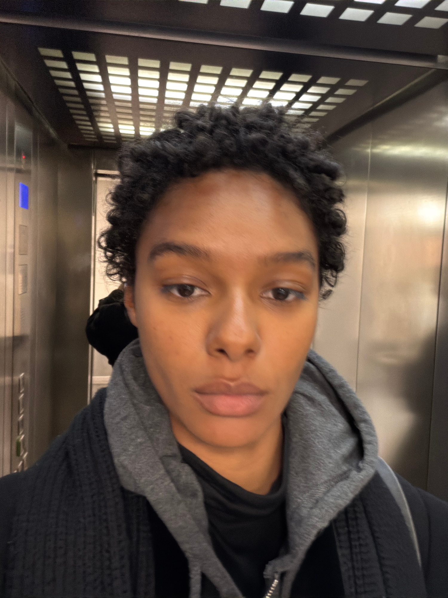 The image displays an adult female inside an elevator located in Pantin, France. The subject, possessing a medium-dark complexion and short, dark, curly hair, faces directly forward, appearing to capt…read more