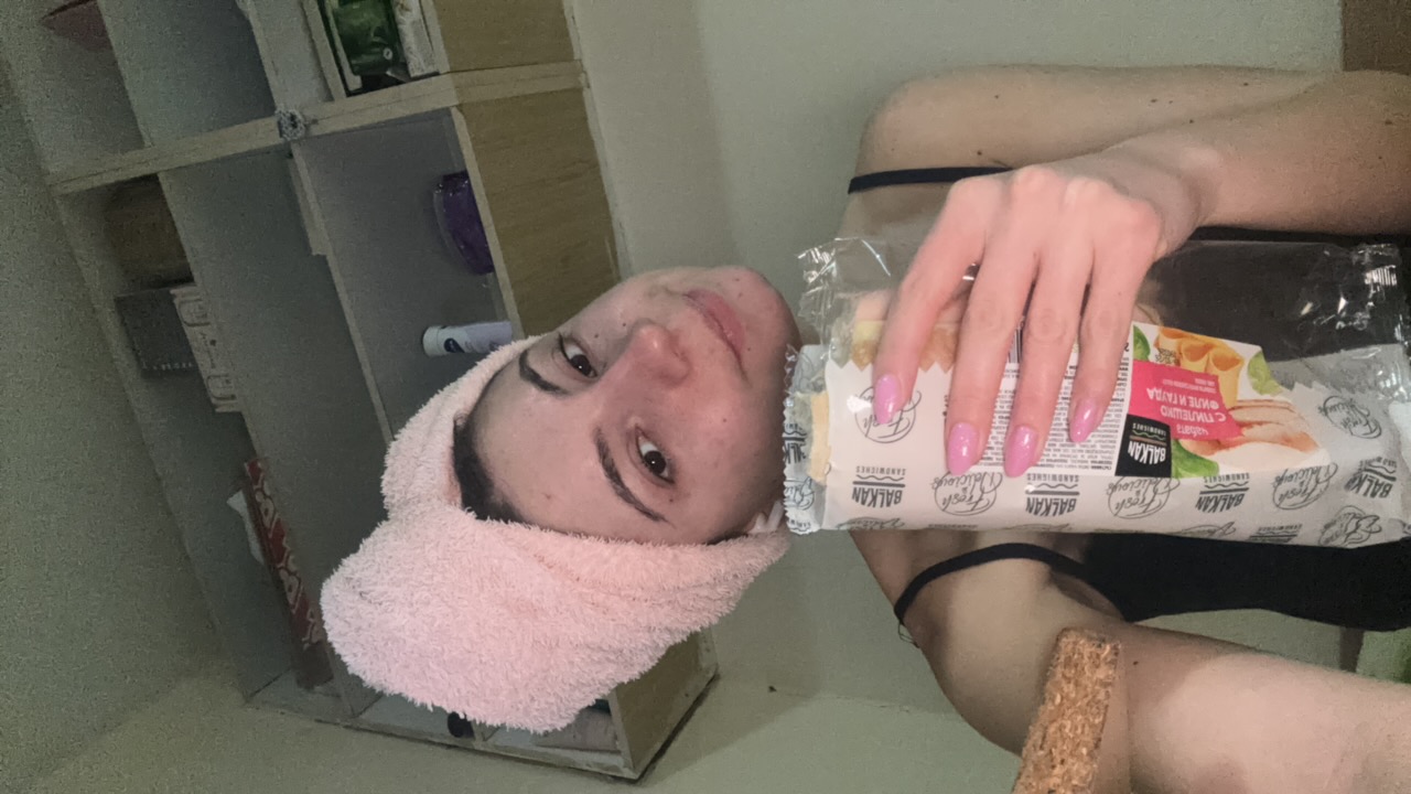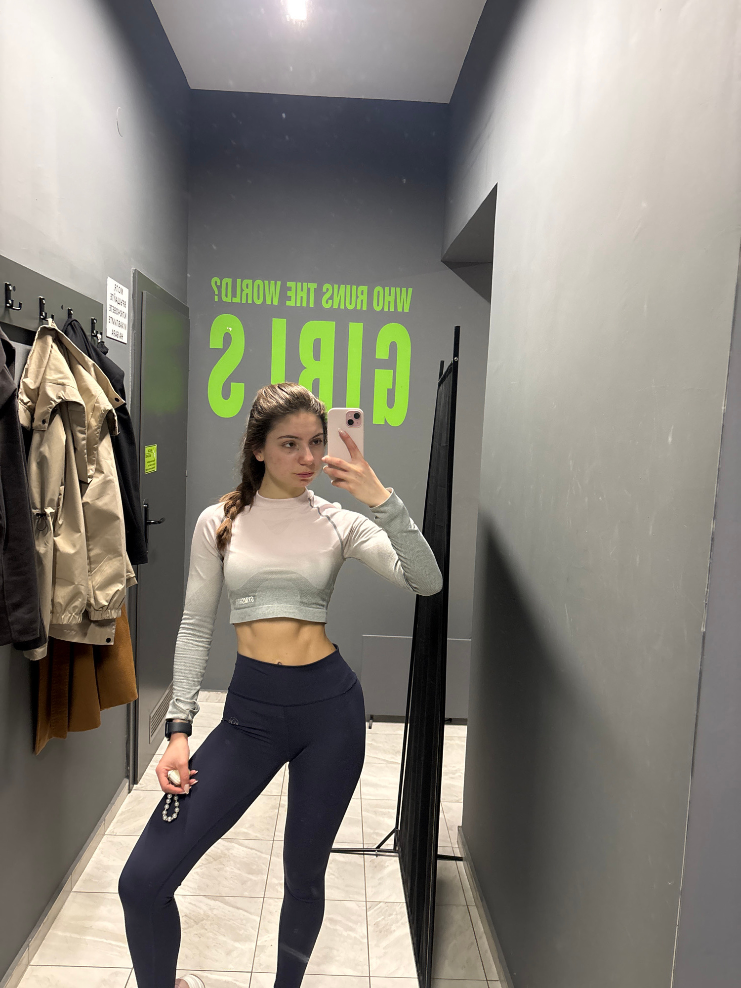 A woman in workout clothes holds a phone, taking a selfie in a gym locker room. The locker room has gray walls with the words "GIRLS, WHO RUN THE WORLD?" written in green. There are coats and jackets…read more