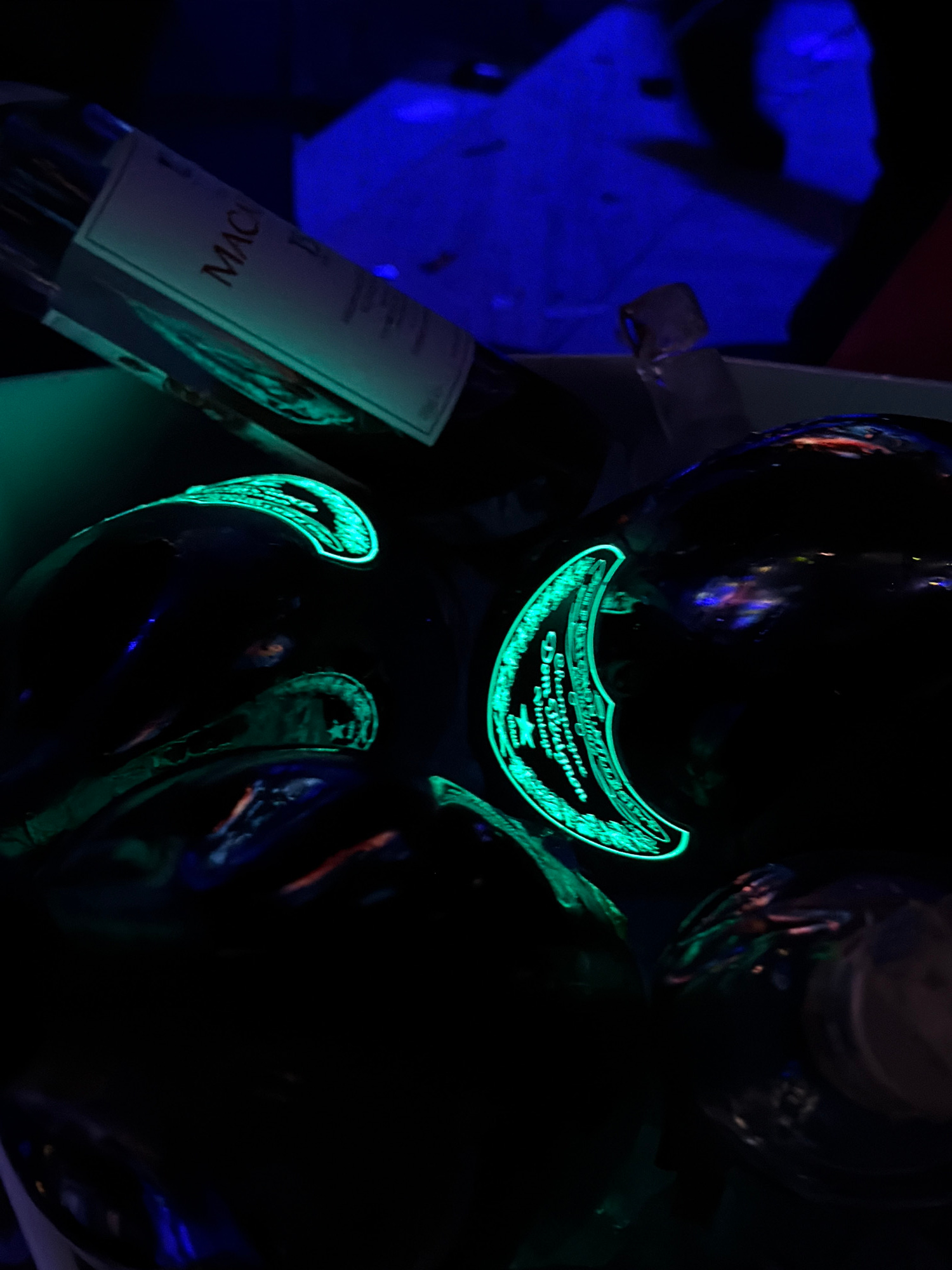 The image shows several bottles of champagne, one with a prominent, glowing label that reads "Champagne Dom Perignon Vintage" and another partially visible label that appears to read "MAC". The bottle…read more