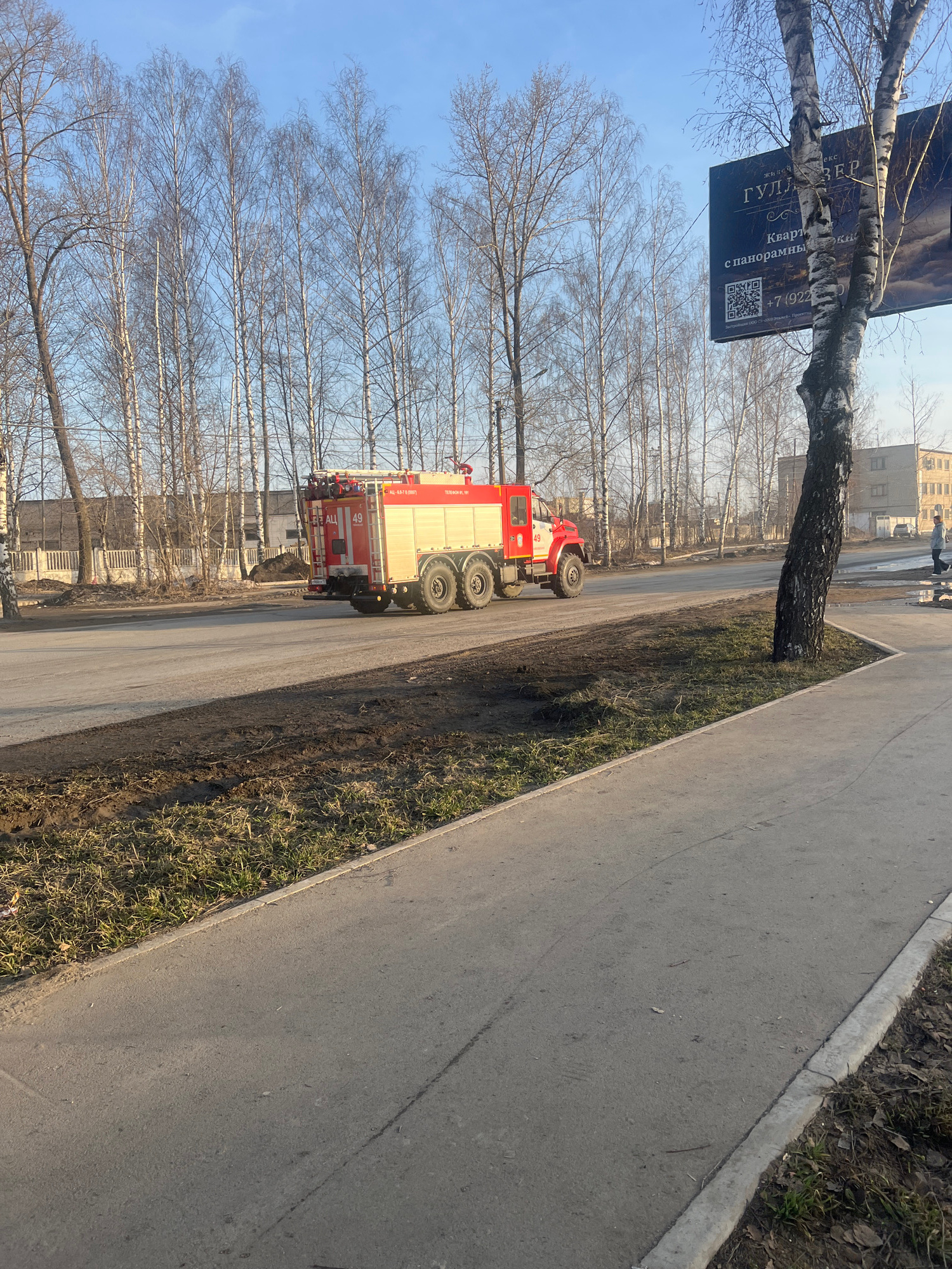 A fire truck is located on a street, with a tree along the sidewalk and a commercial billboard. Based on the markings on the fire truck, this image may be located in the city of Chaikovsky, Russia.