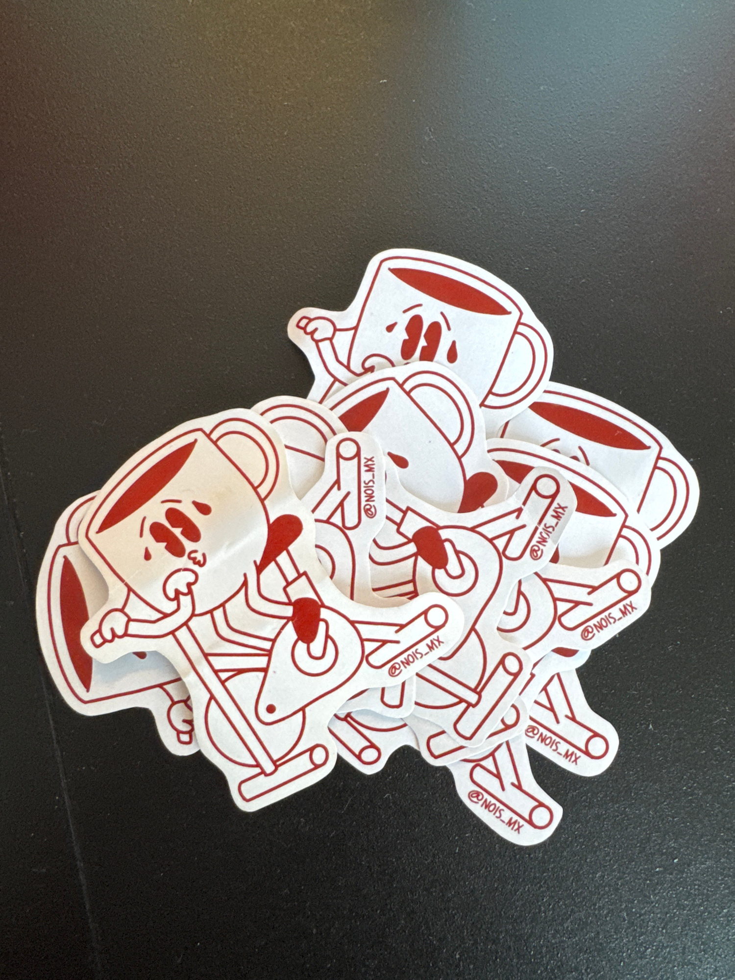 A pile of white stickers with red line art sits on a black surface. The stickers depict two distinct designs: one is a cartoonish coffee mug with a face, and the other is a stylized image resembling a…read more