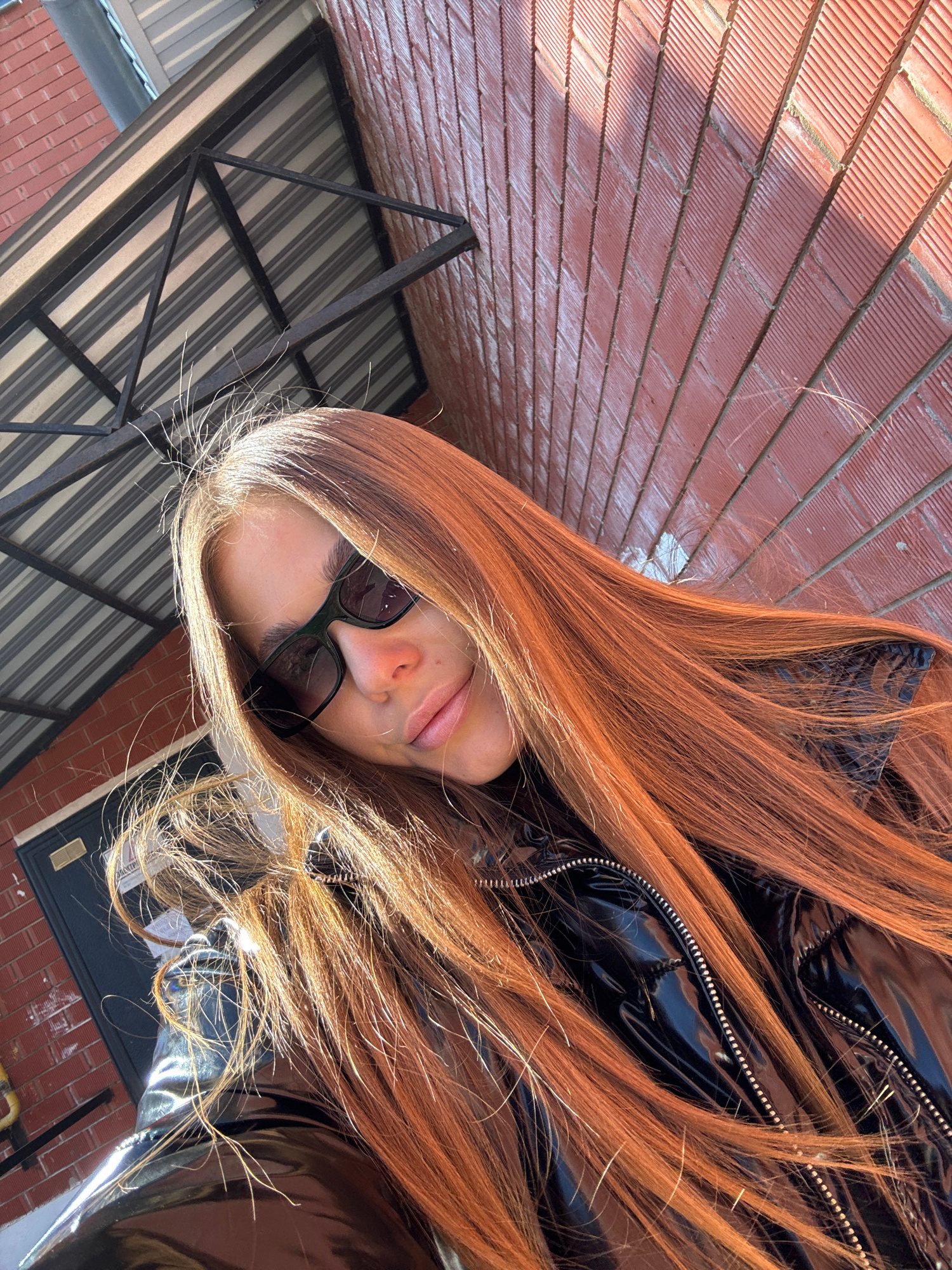 The image shows a person with long, reddish-blonde hair and sunglasses lying on their back outdoors. They are wearing a shiny, black jacket with a zipper. The person appears to be positioned beneath a…read more