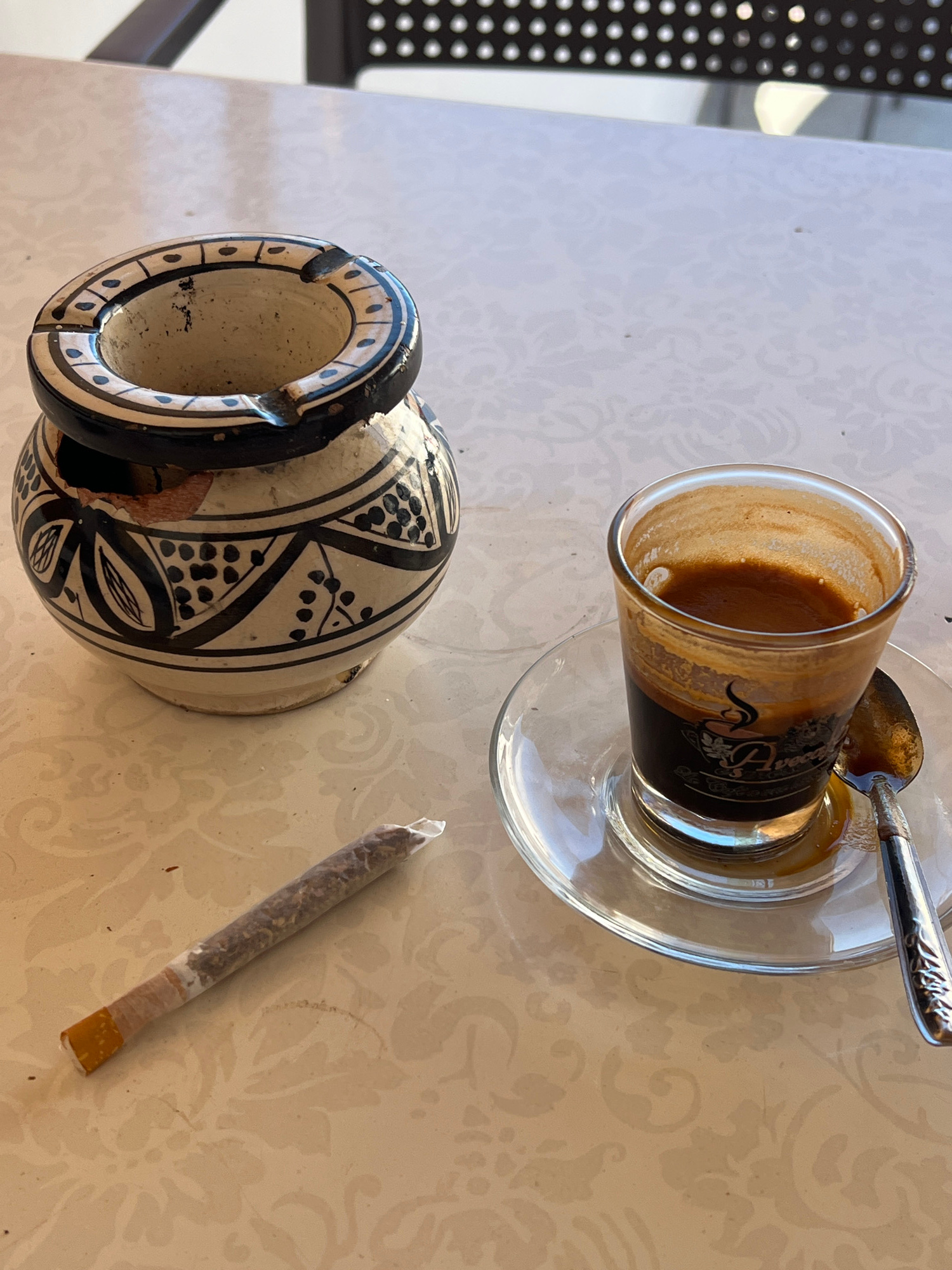 On a patterned white tabletop, an espresso cup sits on a clear saucer with a spoon. Nearby, a decorative ceramic ashtray and a rolled cigarette are placed. The setting appears to be in Tangier, Morocc…read more