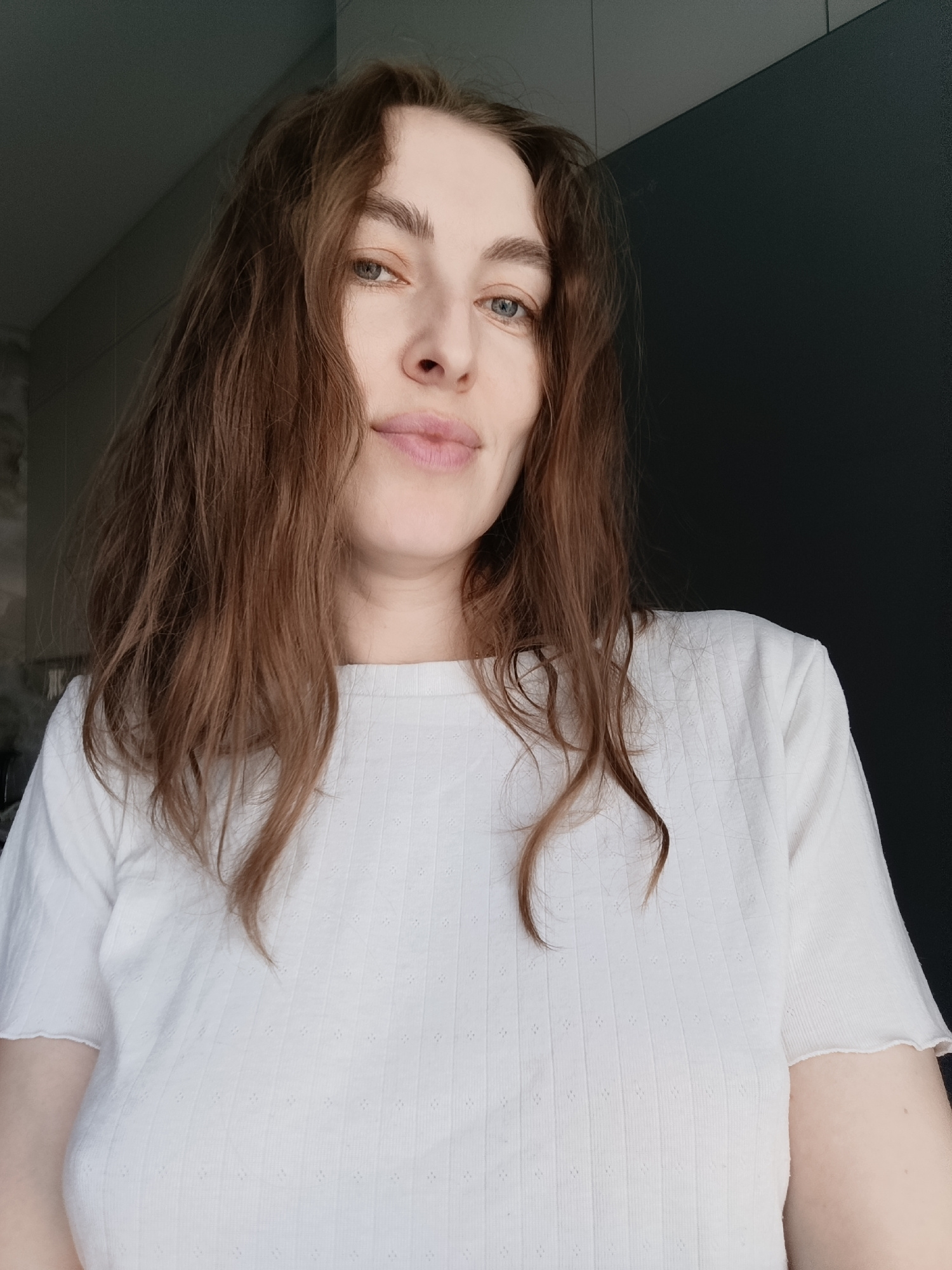 A chest-up portrait captures a woman with long, wavy, light brown hair that frames her face. She has light-colored eyes, possibly blue or grey, and looks directly at the viewer with a neutral expressi…read more
