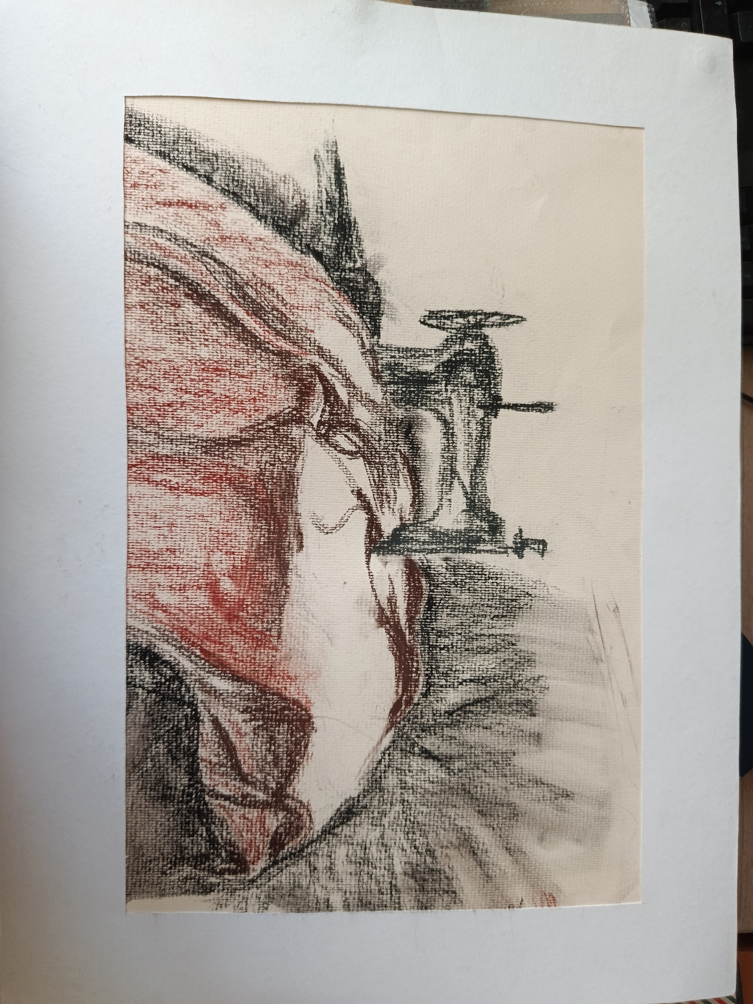 A charcoal and chalk drawing on paper, matted in white, depicts drapery and a vise. The drapery is primarily rendered in red chalk and charcoal, with lighter areas suggesting folds and highlights. The…read more