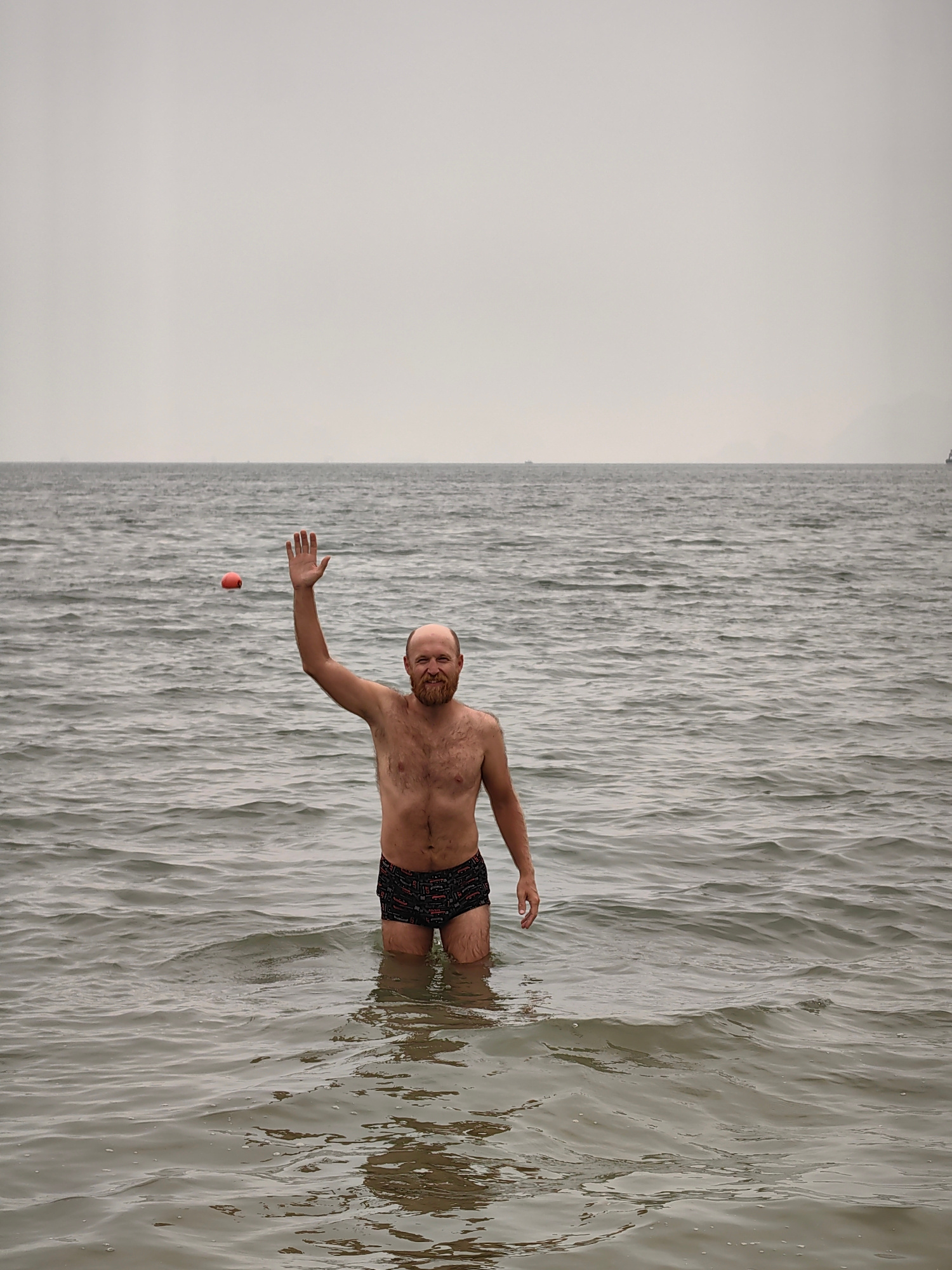 A man stands in water, up to his waist, on a beach in Bai Chay Ward, Vietnam. He is fair-skinned, bald, and has a red beard. He is wearing black swim trunks with red patterns. His right arm is raised,…read more