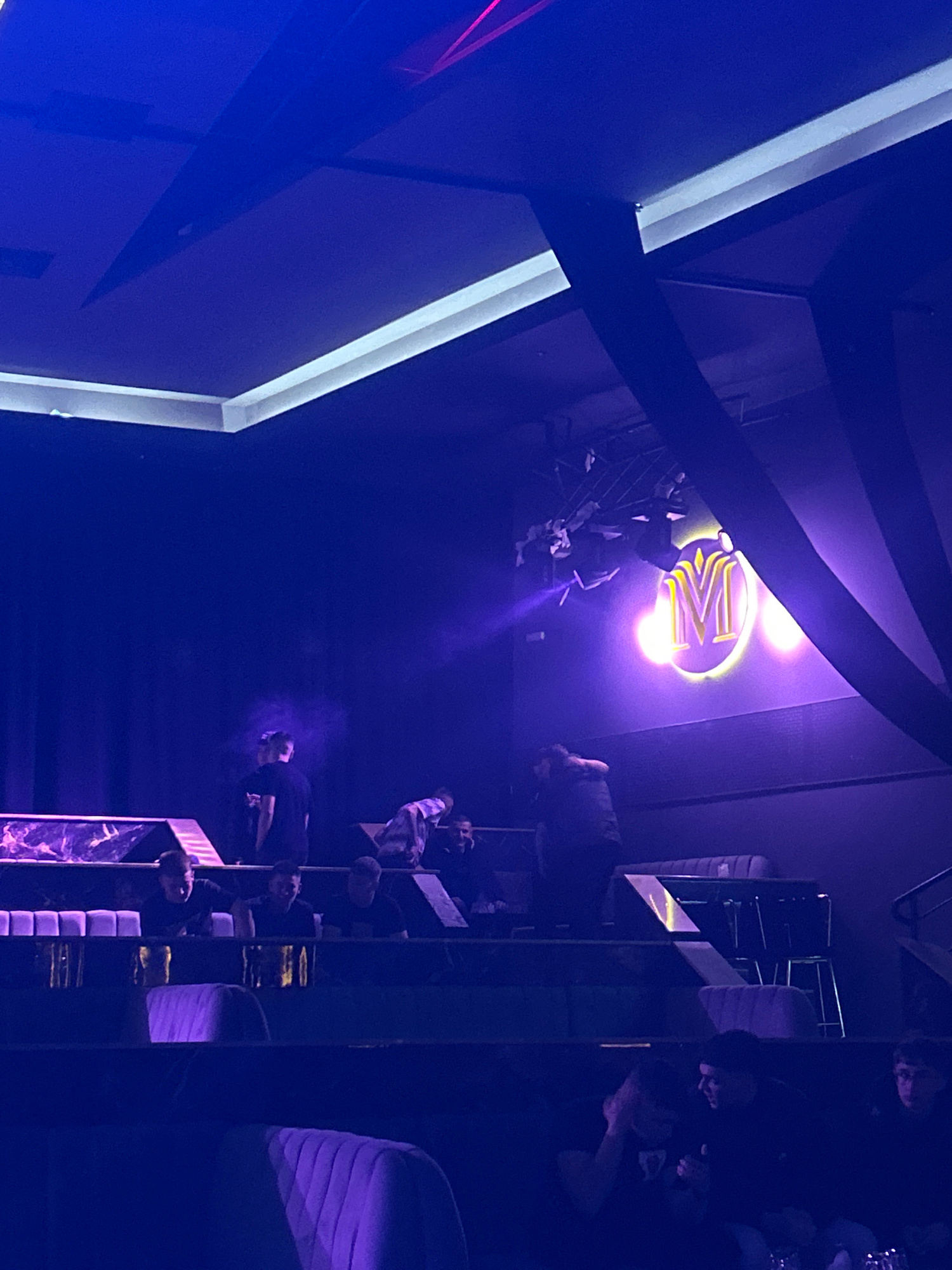 The image depicts an indoor scene, likely a nightclub, lounge, or bar, characterized by its deep purple and blue ambient lighting. The perspective is from within the space, looking towards a prominent…read more