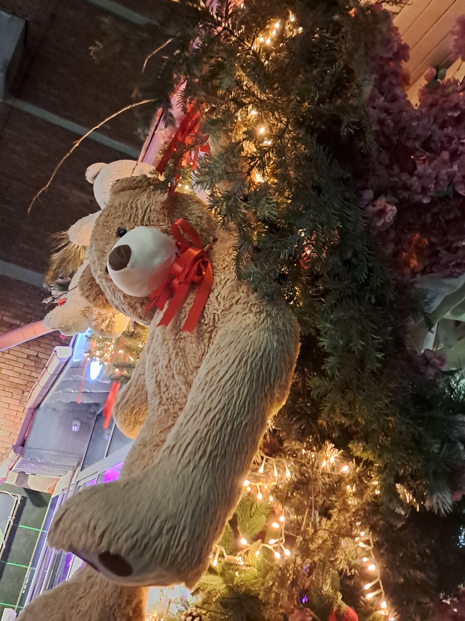The image shows a large, stuffed reindeer decoration hanging upside down from a garland of greenery and Christmas lights. The reindeer is brown with a white muzzle and dark nose. It has red ribbon ant…read more