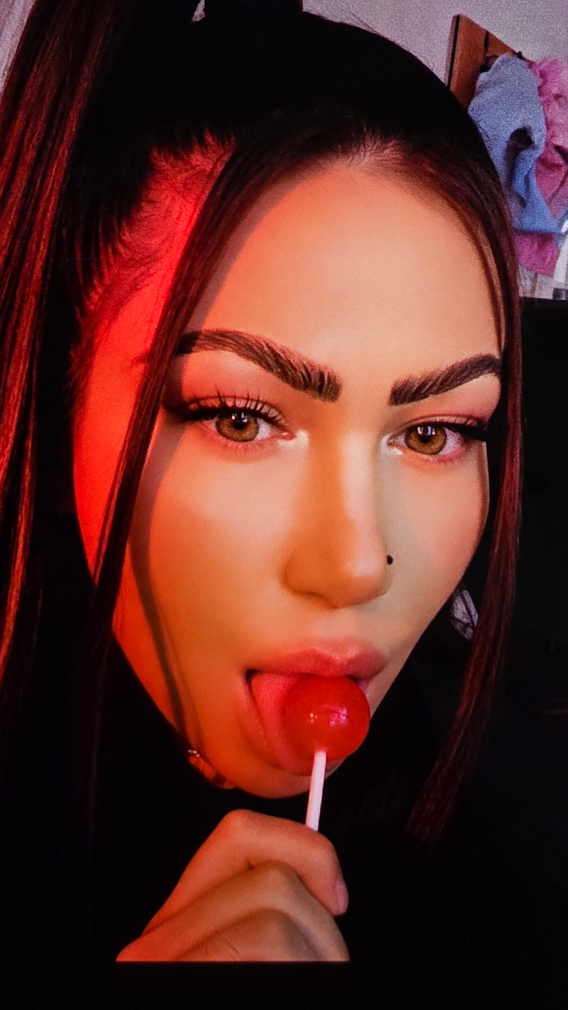 A close-up, angled shot of a woman with brown hair and light skin, holding a red lollipop to her mouth with her right hand. The lollipop touches her tongue, which is slightly extended. Her eyes are br…read more