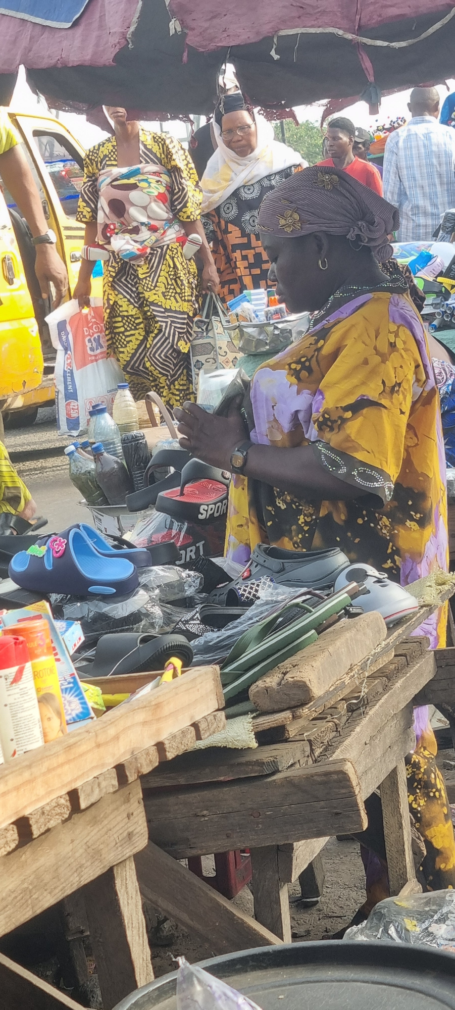 The image depicts a bustling commercial scene in Lagos, Nigeria. A woman wearing a yellow and purple patterned garment and a headwrap is the central figure. She appears to be engaged in commerce. To h…read more