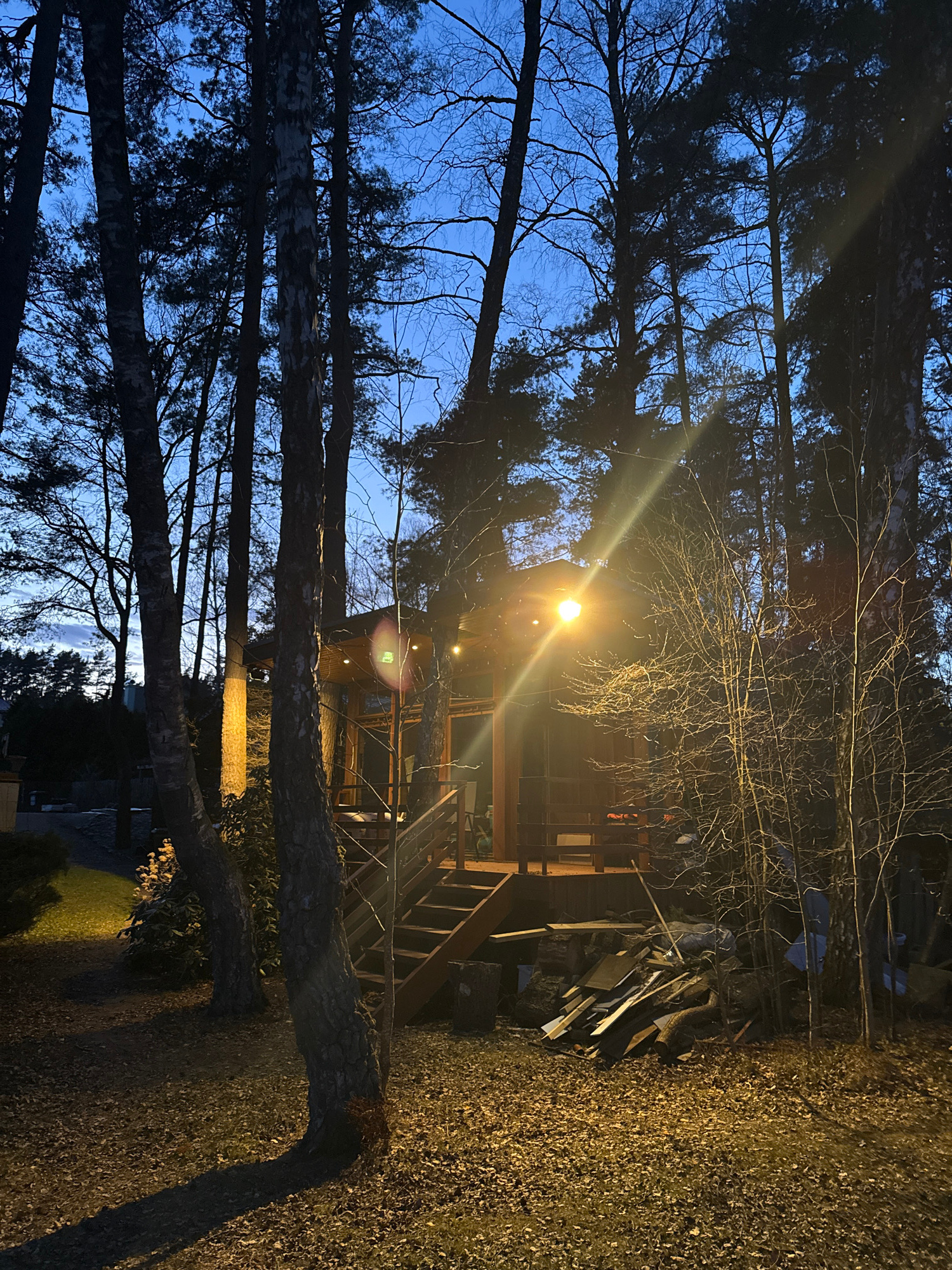 The image shows an outdoor scene at dusk in Baltezers, Latvia. The camera is oriented vertically, looking upwards through a thicket of trees. The sky is a deep blue, visible through the branches. A br…read more