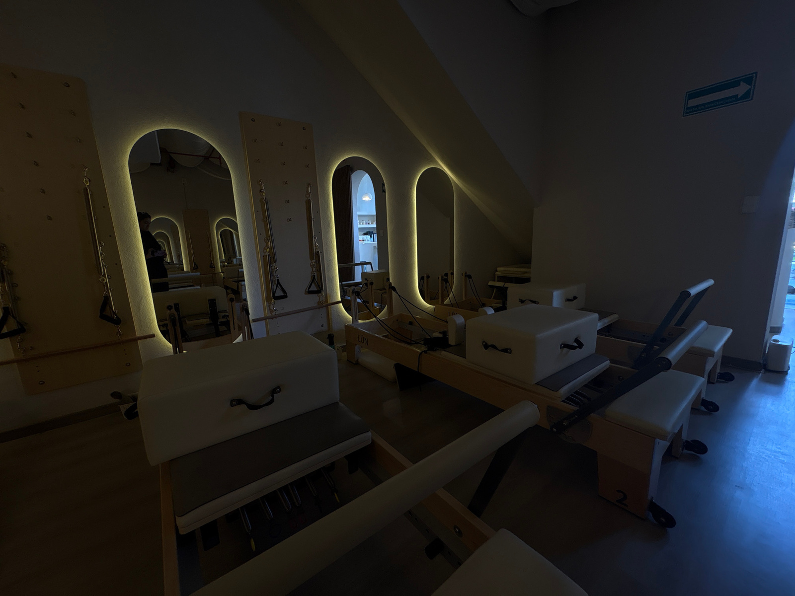 The image shows a dimly lit indoor space, possibly a pilates studio in Mexico City, Mexico, judging by the emergency exit sign. The studio contains several pilates reformer machines arranged in a row.…read more