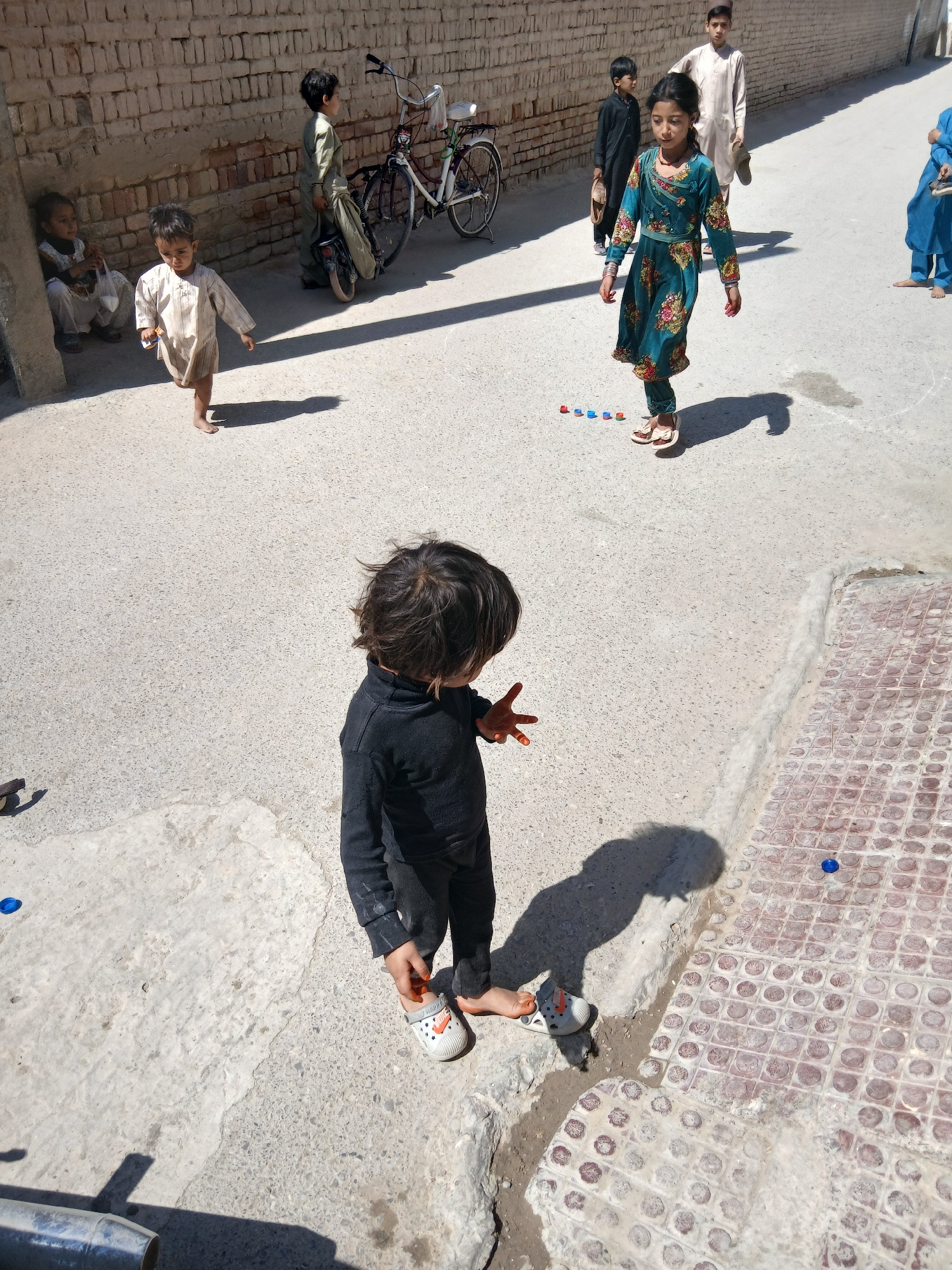 The image depicts an outdoor scene in Quetta City Tehsil, Pakistan. Several individuals are present, including children and adults, engaged in various activities. One child, wearing a black outfit, is…read more