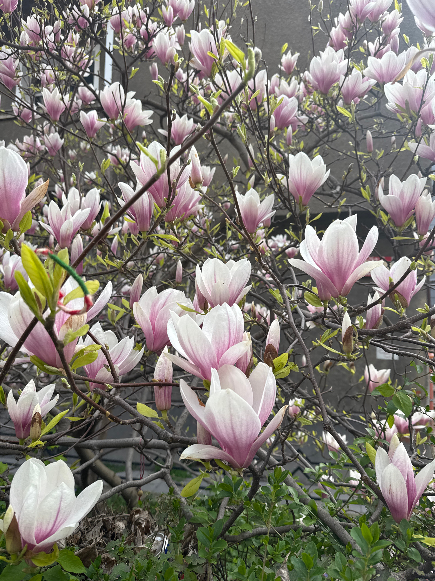 A close-up shot of blooming magnolia tree branches fills the frame. The petals of the magnolia flowers are white at the tips and transition to a light pink at the base. The branches are dark and inter…read more