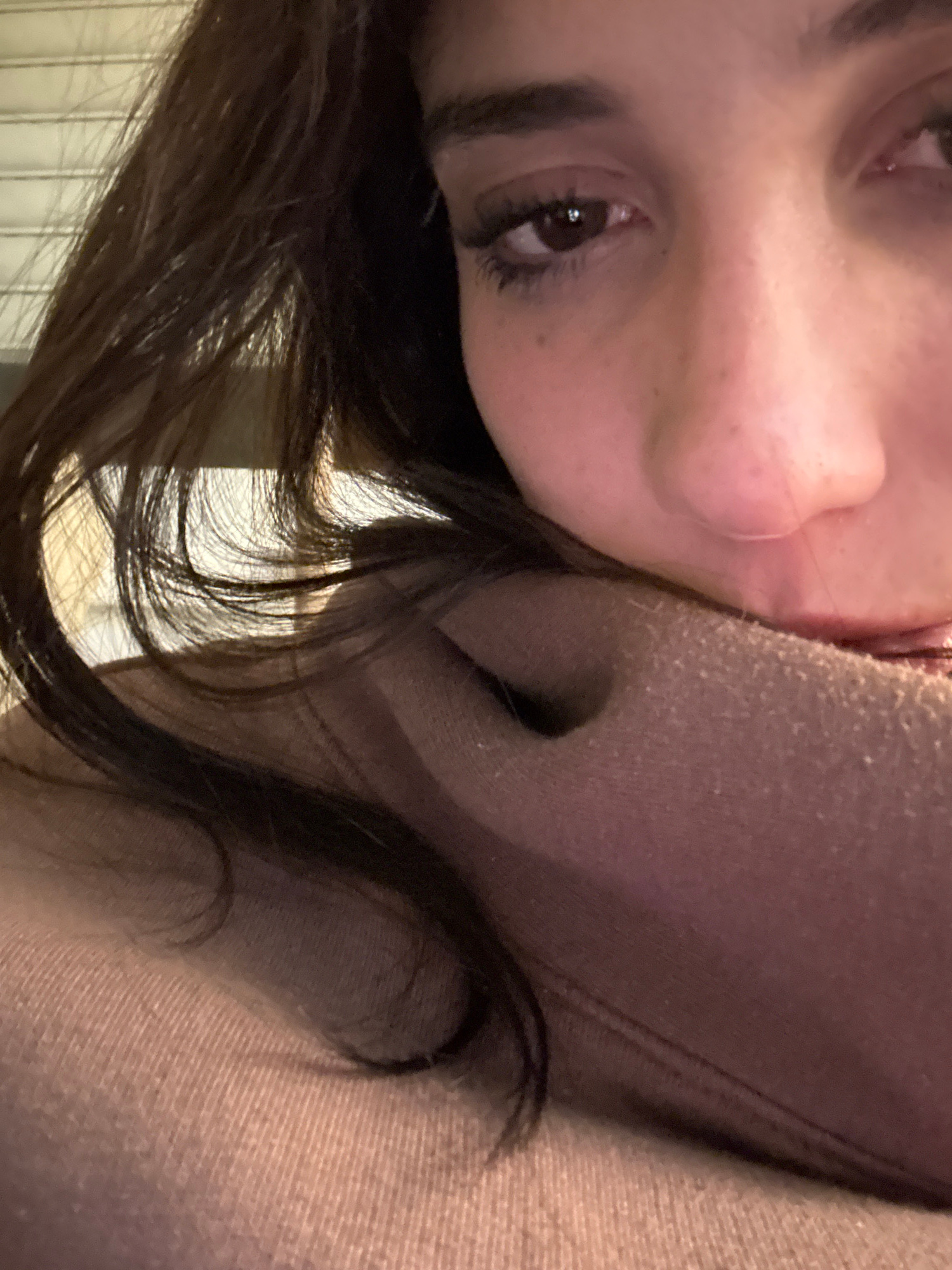 A close-up, slightly angled view features a person's face, predominantly the upper portion. The face shows details like the nose, eyes, and eyebrows, with some freckles visible. The person's hair is d…read more