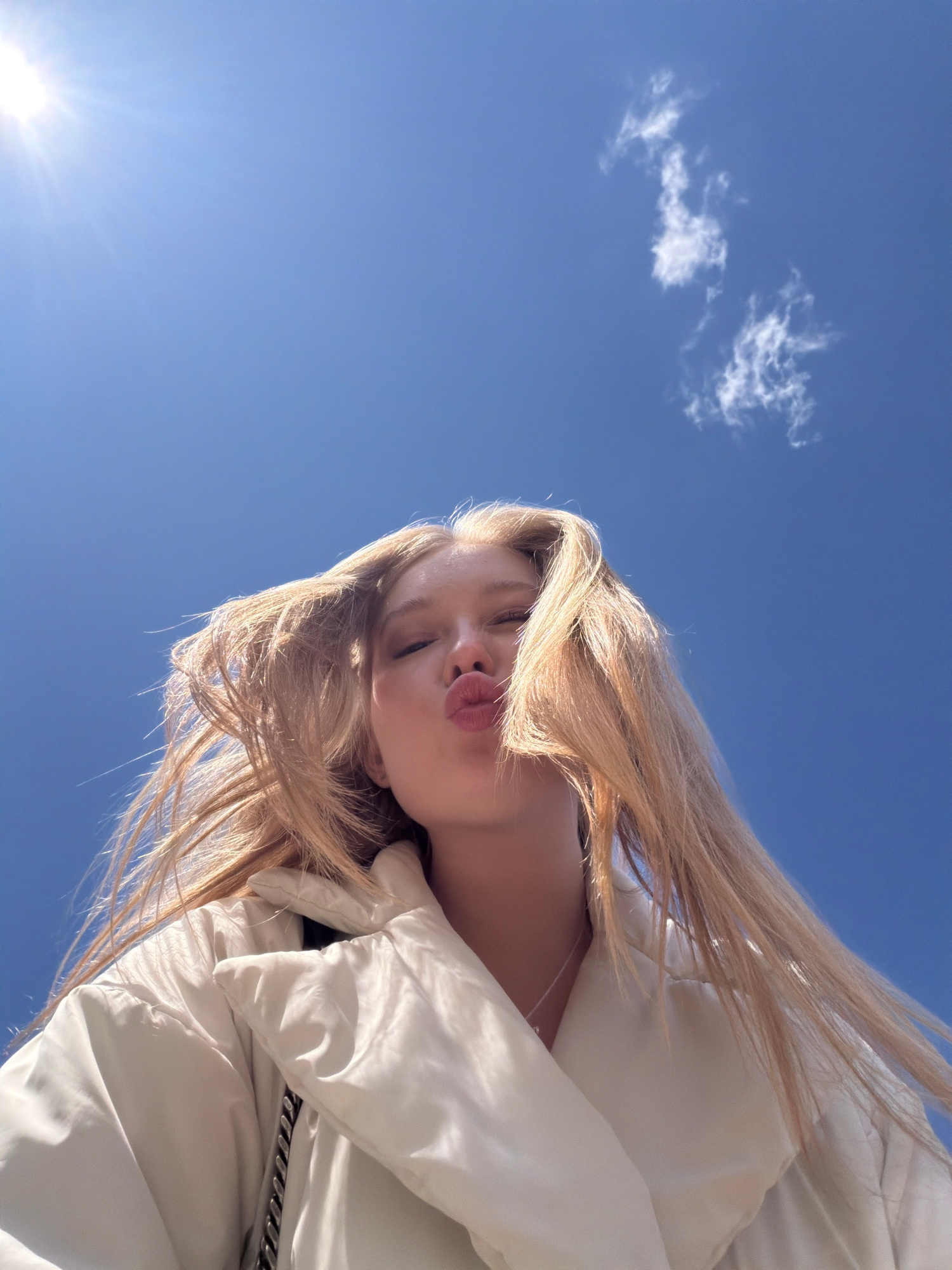 A low-angle shot looking up at a light-skinned female with blond hair, puckered lips, and closed eyes. She is wearing a white puffy jacket. Above her is a bright blue sky with a small cloud. The sun i…read more