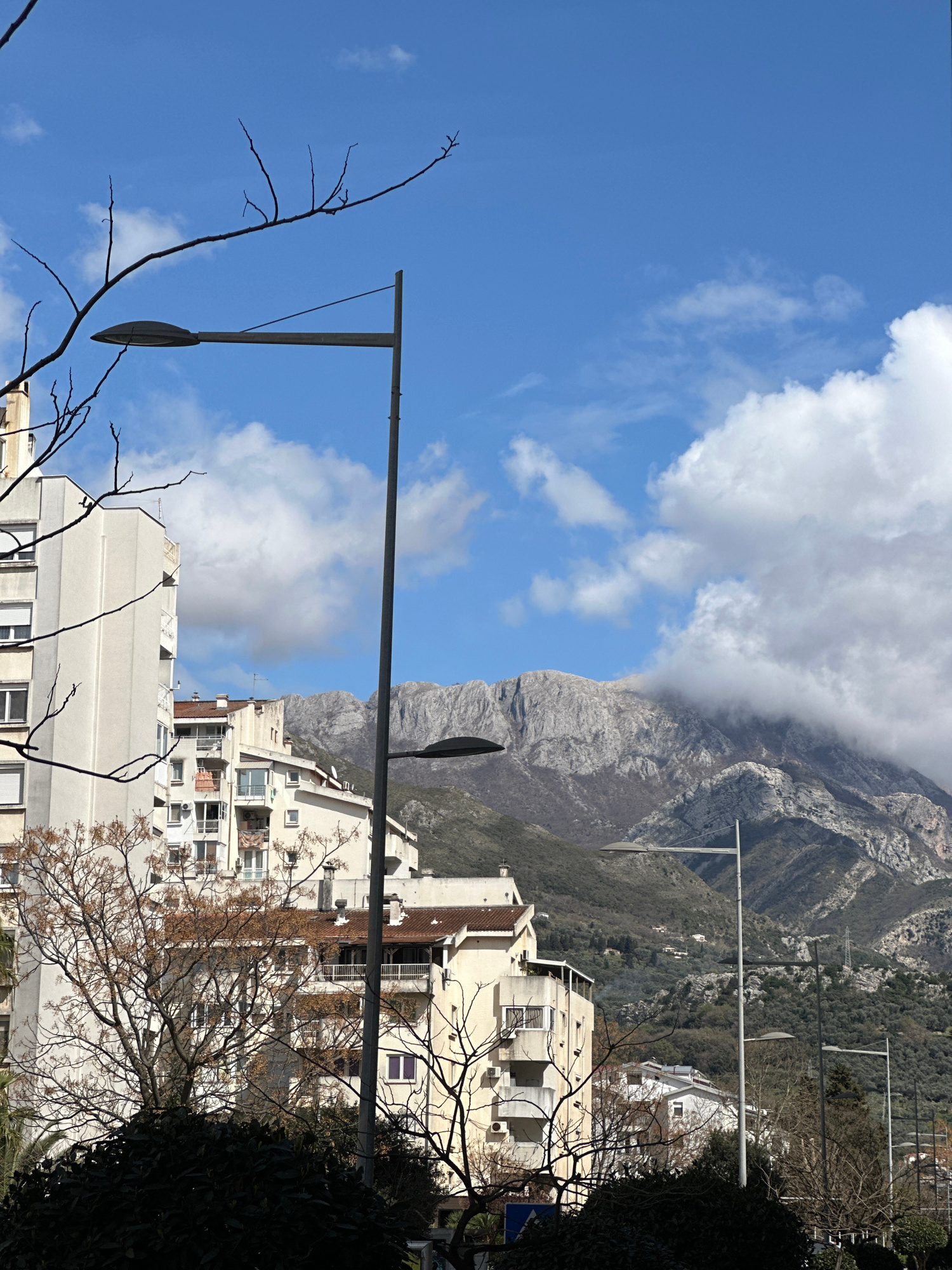 The image depicts a view in Šušanj, Montenegro, with buildings and a mountain range visible against a blue sky with clouds. A street lamp is in the foreground, partially obscured by bare tree branches…read more